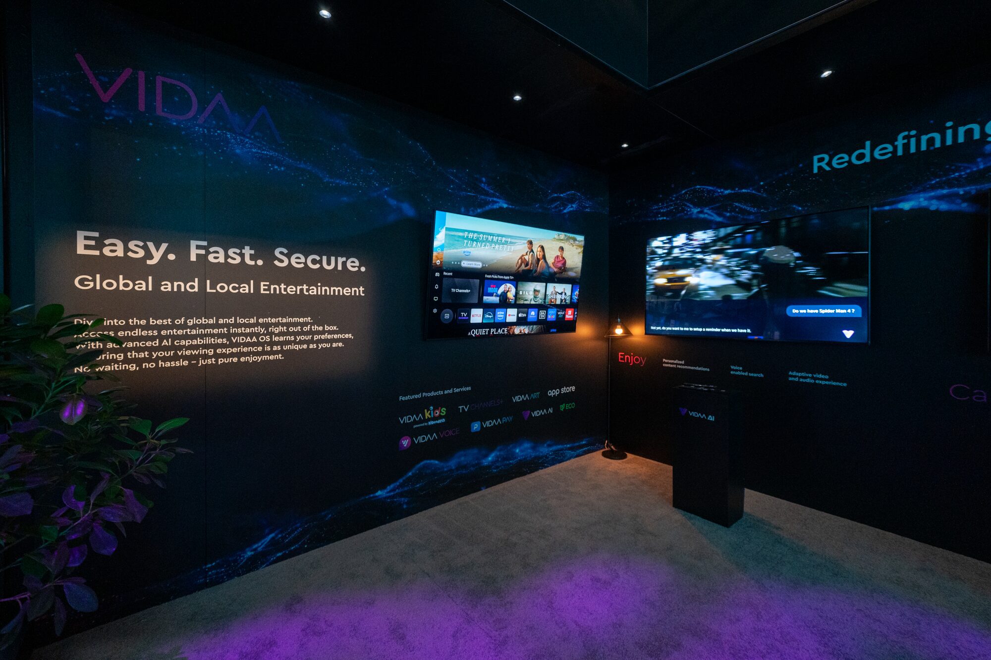 Une photo avec une femme regardant trois téléviseurs au dessus desquels est indiqué le mot VIDAA