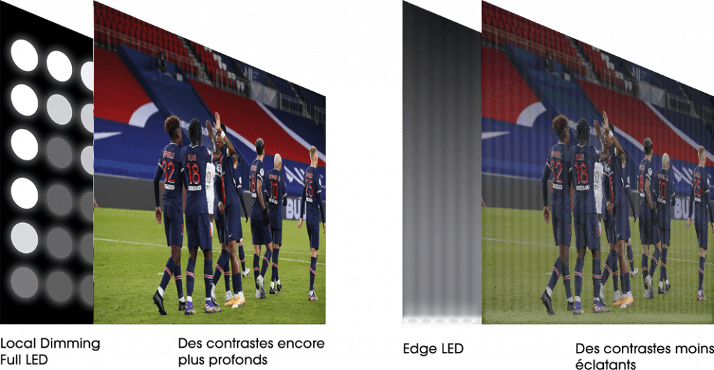 Un écran Full LED Local Dimming améliore le contraste de l'image en contrôlant chaque zone du rétroéclairage. La gestion du rétroéclairage sur l'ensemble de l'écran permet d'obtenir une image optimisée de manière homogène avec des noirs plus profonds et des blancs plus lumineux. Tout cela se traduit par une expérience de visionnage plus précise et plus dynamique.