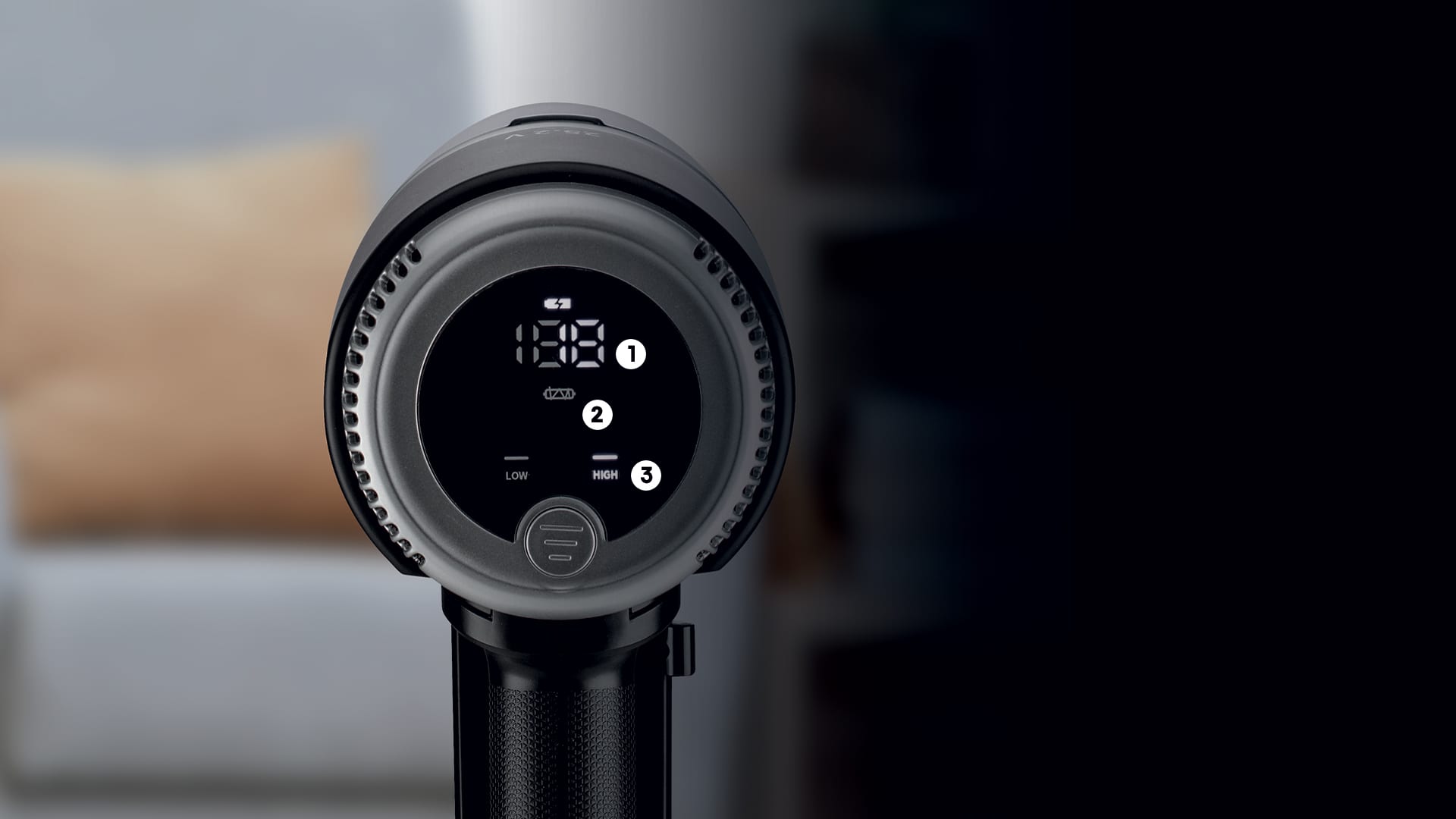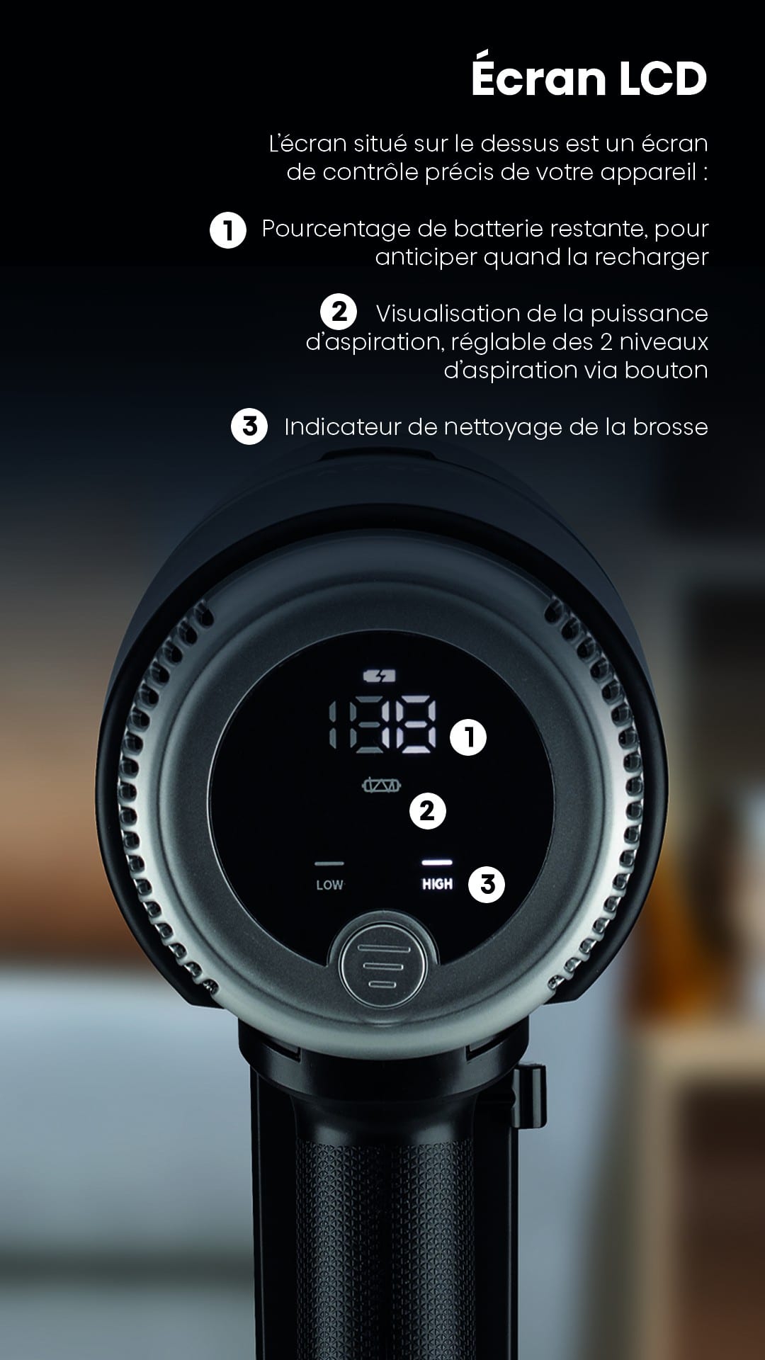 Visualisation de la puissance d’aspiration, réglable des 2 niveaux d’aspiration via bouton
