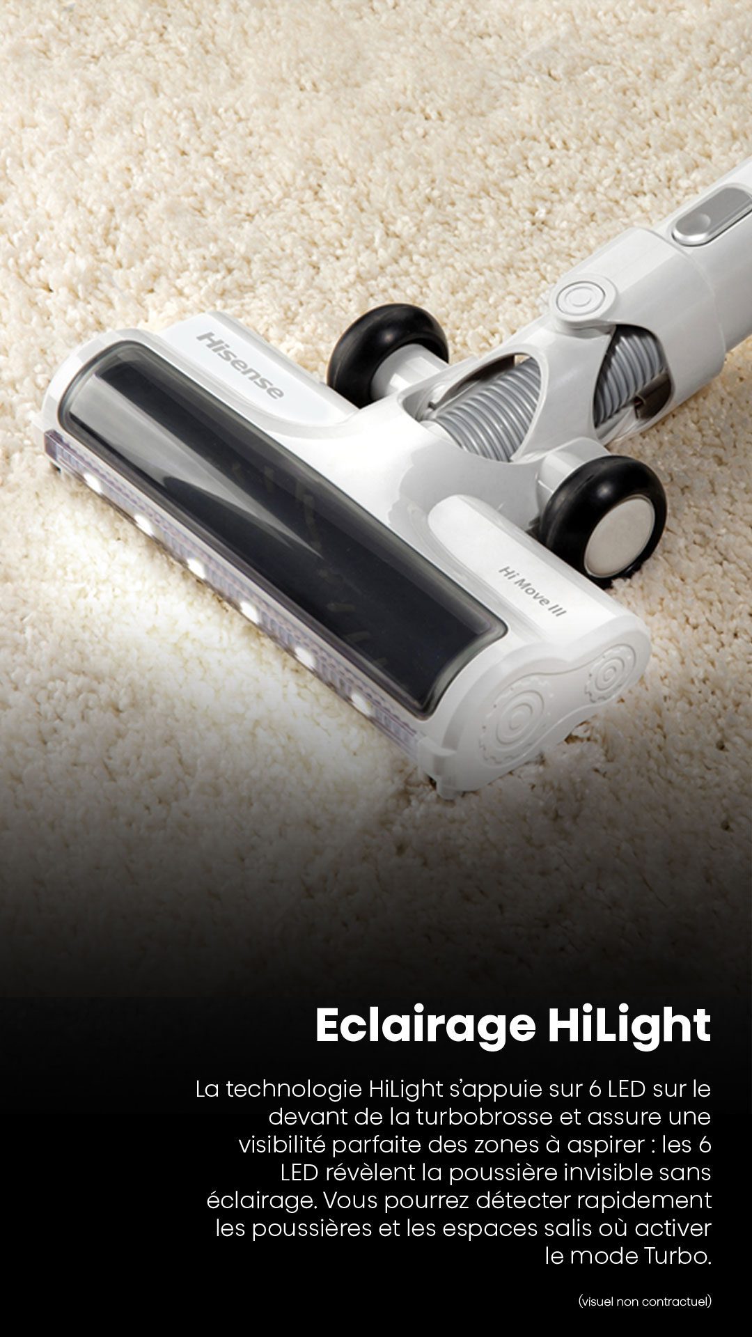 La technologie HiLight s’appuie sur 6 LED sur le devant de la turbobrosse et assure une visibilité parfaite des zones à aspirer : les 6 LED révèlent la poussière invisible sans éclairage.