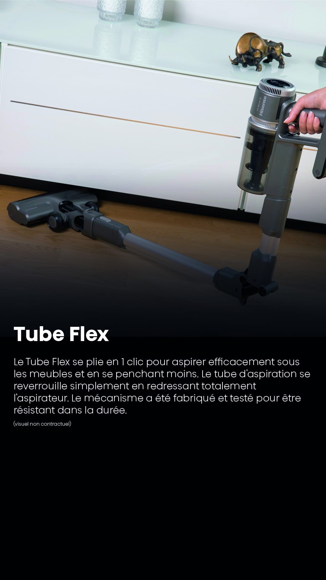 Le Tube Flex se plie en 1 clic pour aspirer efficacement sous les meubles et en se penchant moins. Le tube d’aspiration se reverrouille simplement en redressant totalement l’aspirateur. Le mécanisme a été fabriqué et testé pour être résistant dans la durée. (visuel non contractuel)