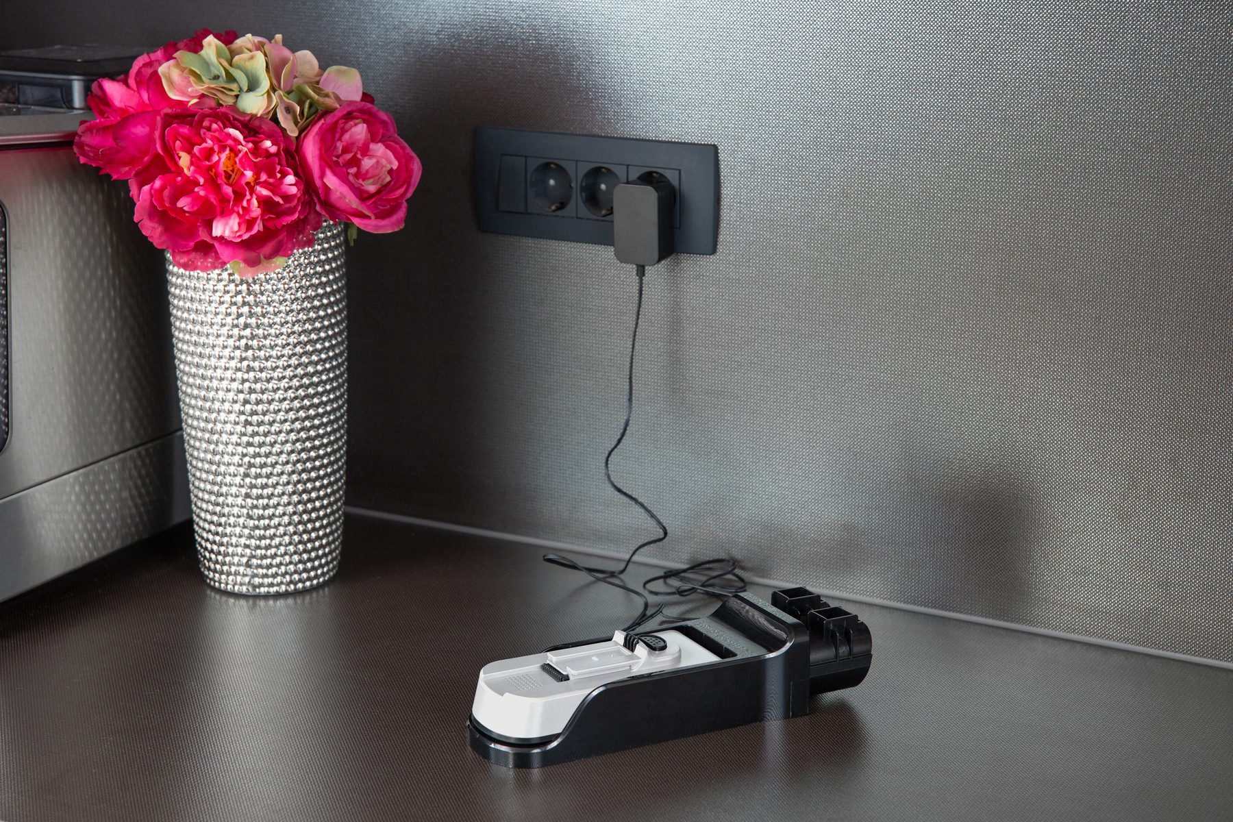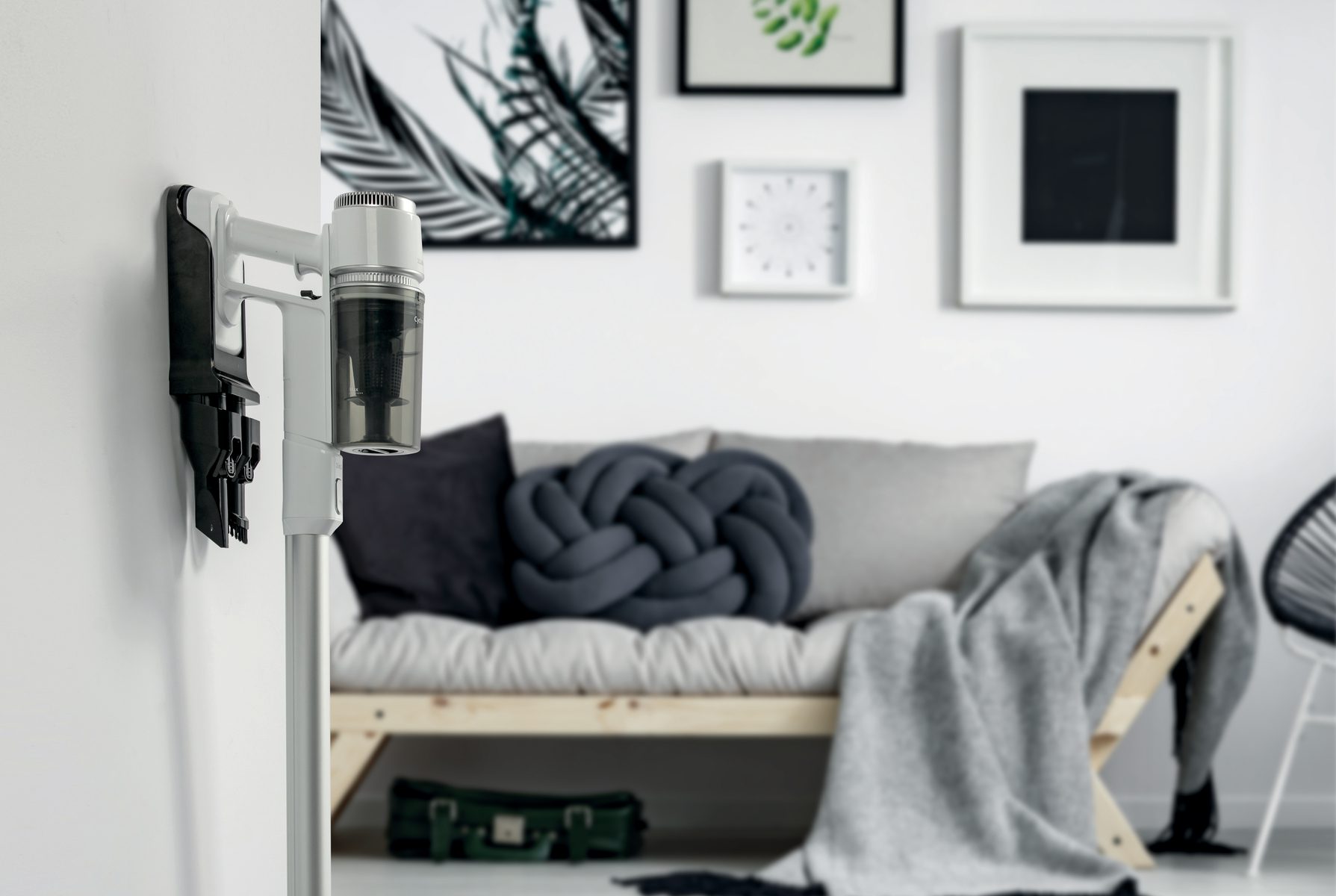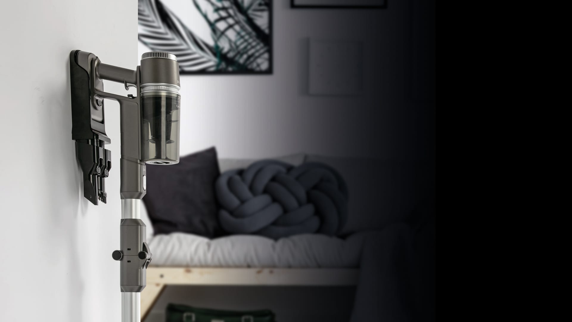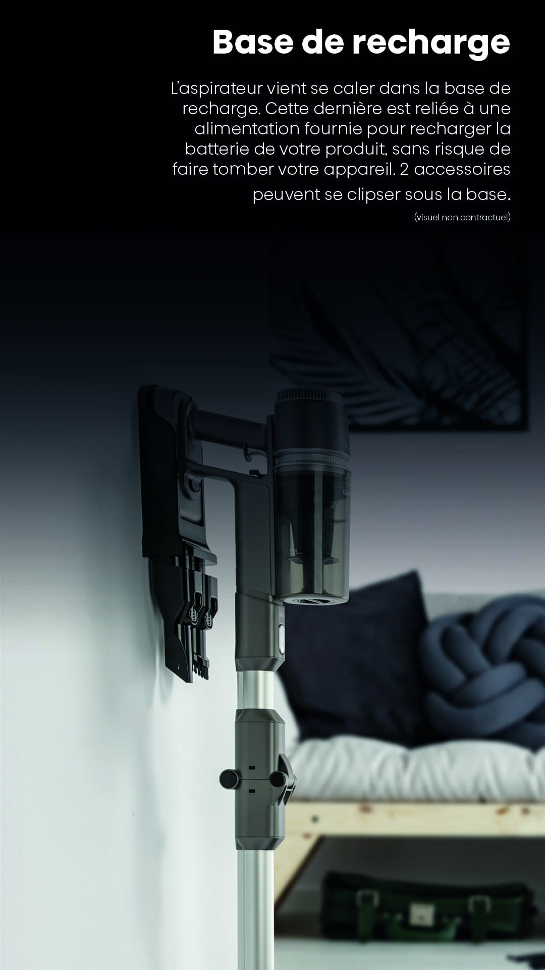 L’aspirateur vient se caler dans la base de recharge. Cette dernière est reliée à une alimentation fournie pour recharger la batterie de votre produit, sans risque de faire tomber votre appareil. 2 accessoires peuvent se clipser sous la base. (visuel non contractuel)