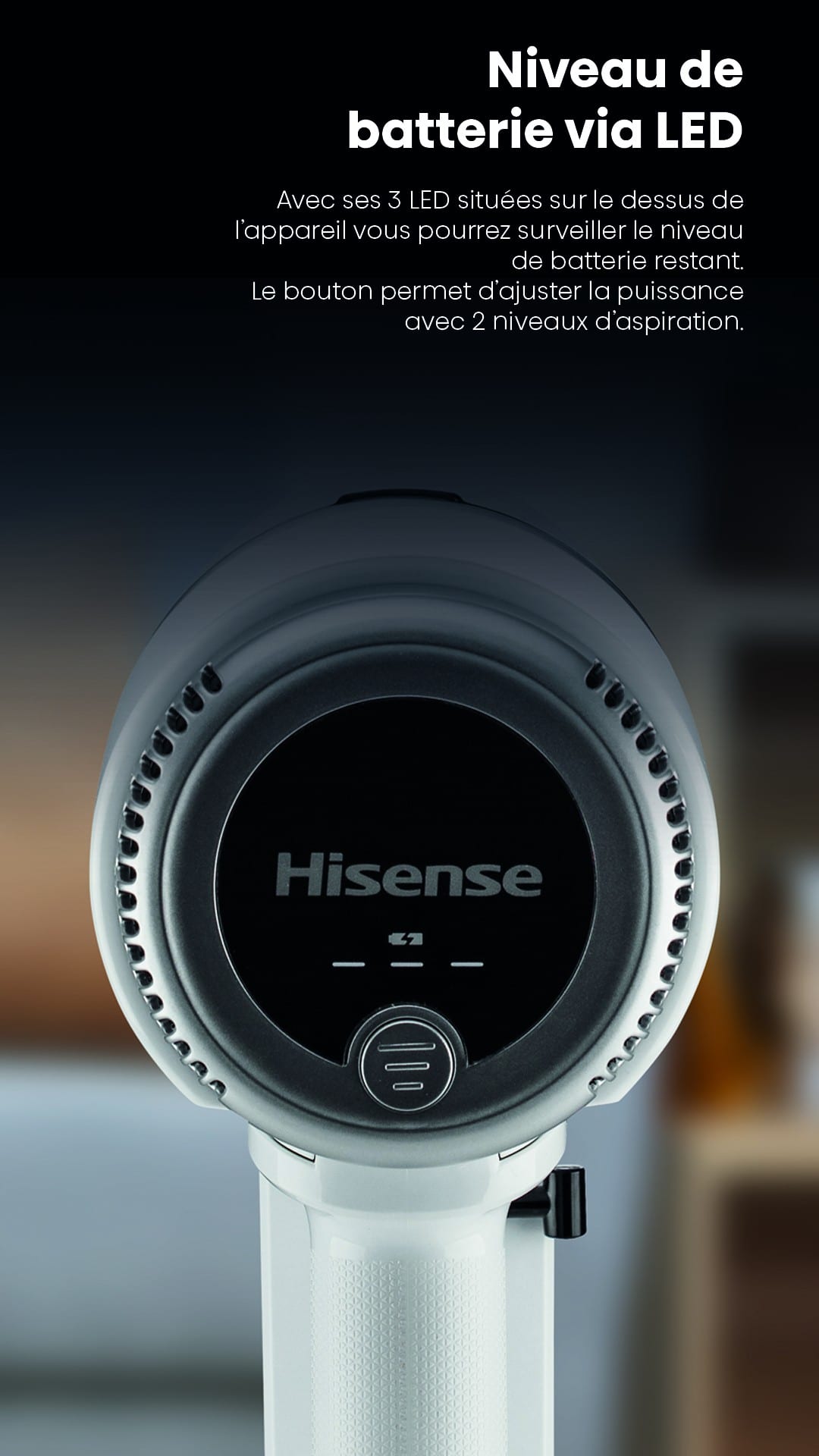 Avec ses 3 LED situées sur le dessus de l’appareil vous pourrez surveiller le niveau de batterie restant. Le bouton permet d’ajuster la puissance avec 2 niveaux d’aspiration.