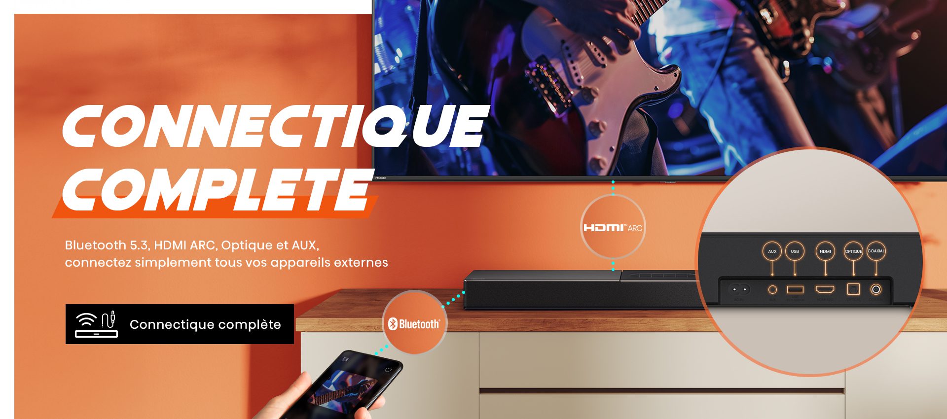 Equipée d'un port HDMI, d'un port USB, d'une prise optique, et d'une prise audio analogique, mais aussi de la connexion sans fil avec le Bluetooth.