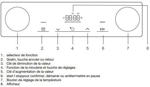 lors du raccordement électrique du four, l'horloge affichera "12:00" et clignotera. A l'aide des touches "Flèche haut" ou "Flèche bas" (repères 3 et 5), vous pouvez régler l'horloge du four. une fois l'horloge réglée, appuyer sur la touche "départ/pause" (repère 6) pour valider l'heure.