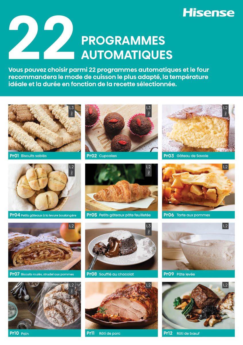 Grâce aux programmes automatiques (allant jusqu'à 22 recettes selon les modèles), vous devez uniquement saisir le type de plat et le poids, et votre four se charge du reste : mode de cuisson, température et durée. Cuisinez comme un débutant mais mangez comme un pro !