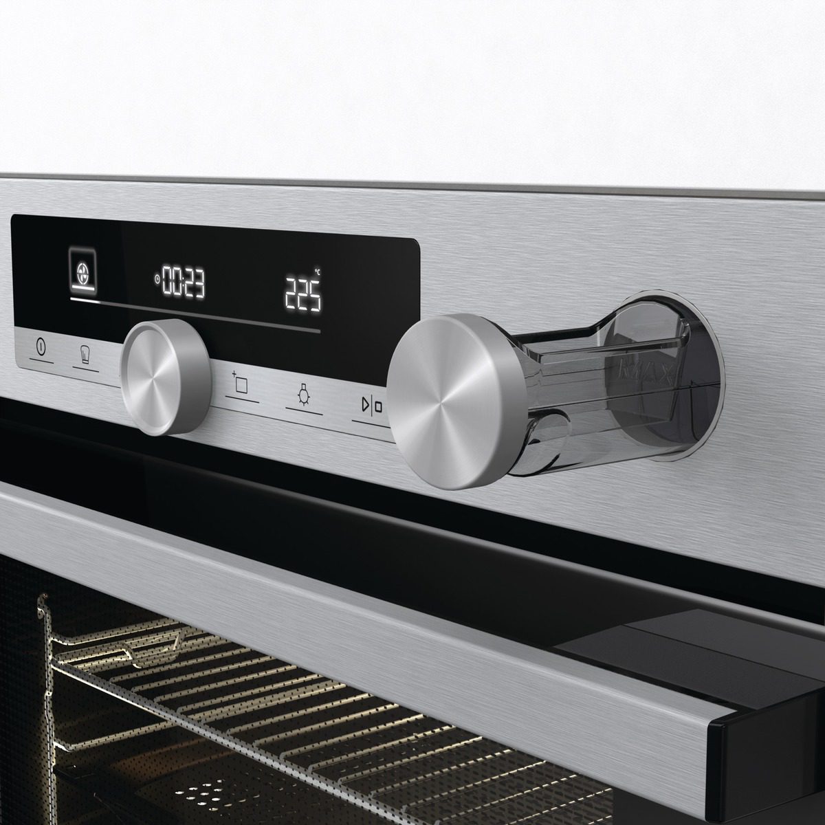 Si vous souhaitez donner du croustillant et du moelleux à vos préparations (pains, pâtisseries, poulet, rôtis), remplissez le réservoir d'eau sur le bandeau de commandes avant la cuisson et appuyez sur la touche Steam Add Plus lorsque le symbole lumineux apparaîtra. A partir de 150° C, de la vapeur sera injectée à travers un évaporateur pour obtenir d’excellents résultats de cuisson.