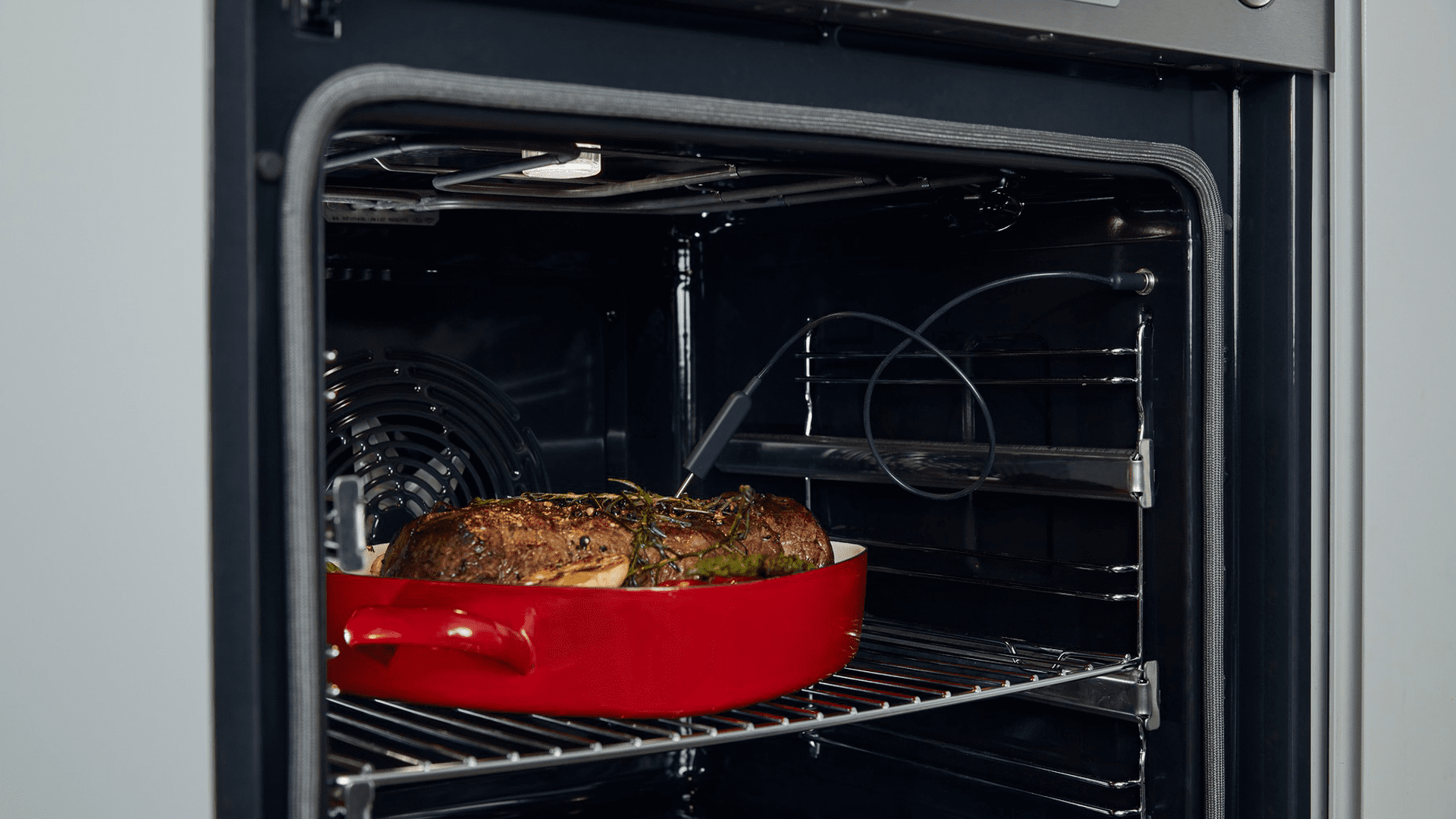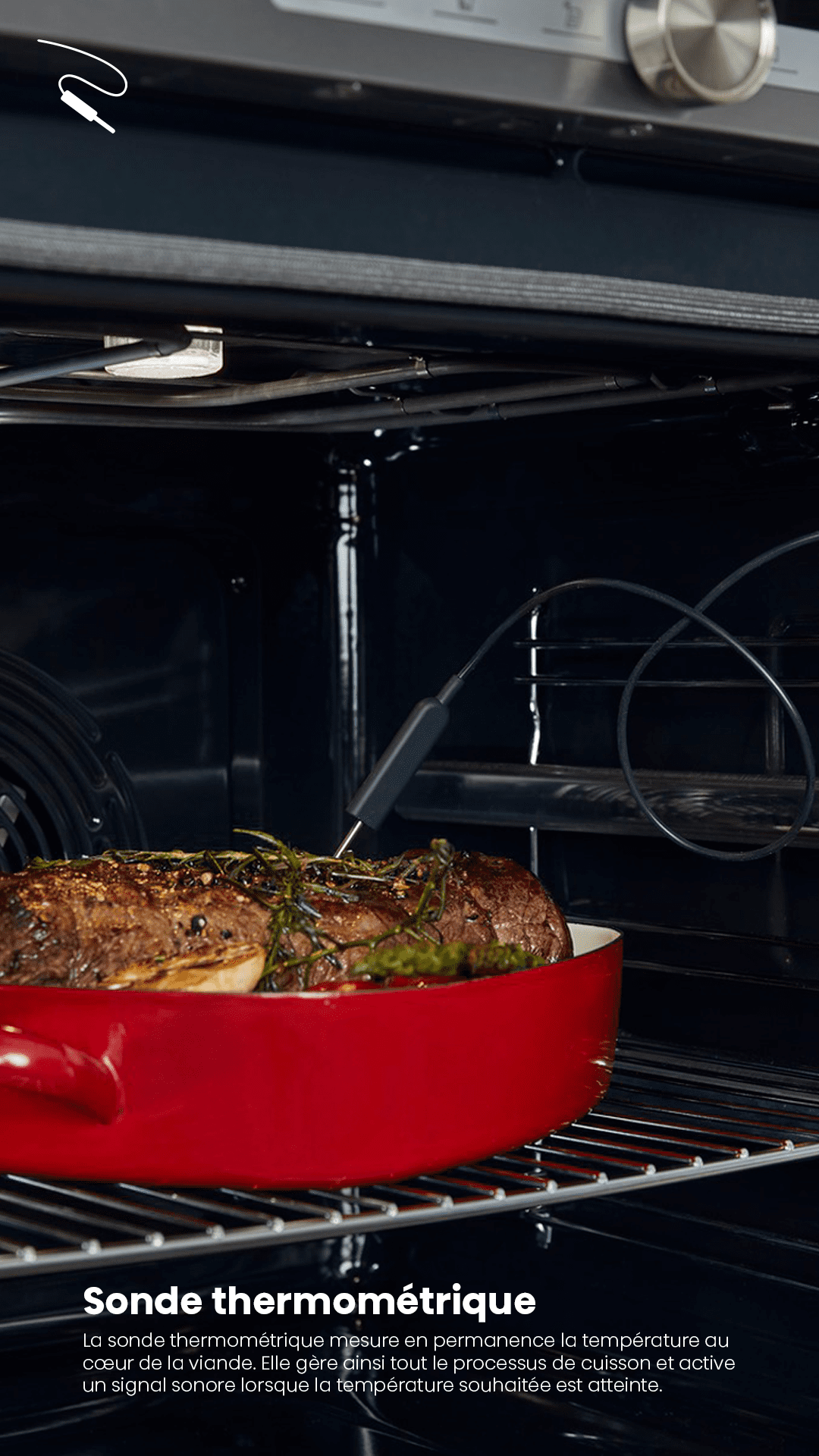 La sonde thermométrique mesure en permanence la température au cœur de la viande. Elle gère ainsi tout le processus de cuisson et active un signal sonore lorsque la température souhaitée est atteinte.