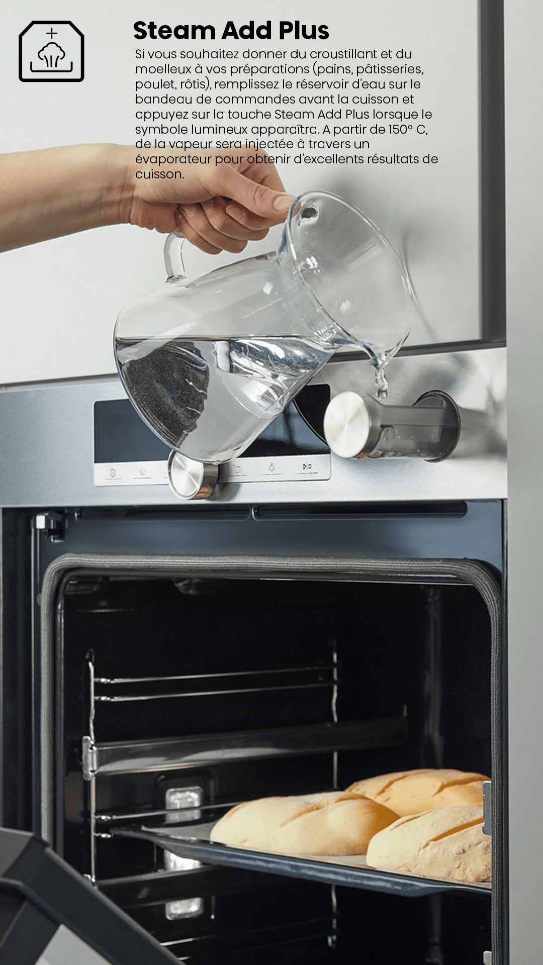 Si vous souhaitez donner du croustillant et du moelleux à vos préparations (pains, pâtisseries, poulet, rôtis), remplissez le réservoir d'eau sur le bandeau de commandes avant la cuisson et appuyez sur la touche Steam Add Plus lorsque le symbole lumineux apparaîtra. A partir de 150° C, de la vapeur sera injectée à travers un évaporateur pour obtenir d’excellents résultats de cuisson.