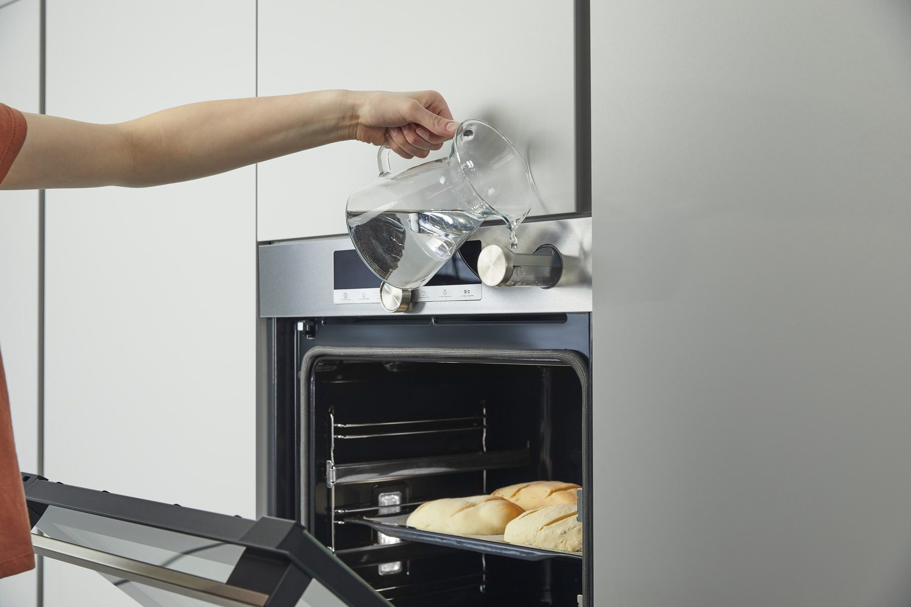 Si vous souhaitez donner du croustillant et du moelleux à vos préparations (pains, pâtisseries, poulet, rôtis), remplissez le réservoir d'eau sur le bandeau de commandes avant la cuisson et appuyez sur la touche Steam Add Plus lorsque le symbole lumineux apparaîtra. A partir de 150° C, de la vapeur sera injectée à travers un évaporateur pour obtenir d’excellents résultats de cuisson.