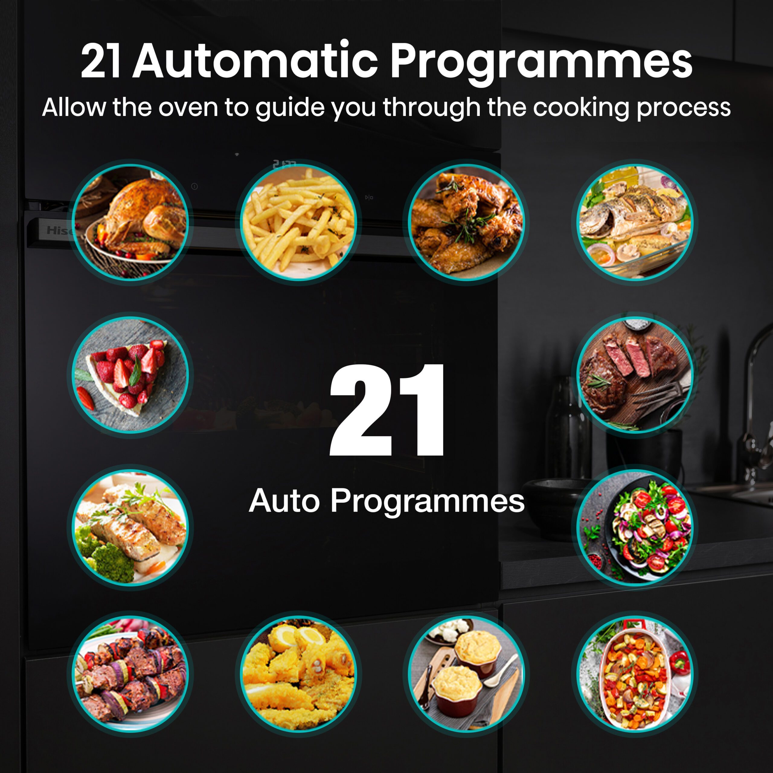 | Modes de cuisson | Convection naturelle, Gril à infrarouges, Chaleur tournante, Gril à infrarouges ventilé, Chaleur tournante avec sole, Chaleur tournante avec voûte, Chaleur tournante avec petit gril, Grand gril et sole, Cuisson lente, Gril avec sole ventilée, AirFry, Pyrolyse, Décongélation, Préchauffage rapide, Chauffe-assiettes, Surgelés, Mode Pizza, Mode Sabbat, Maintien au chaud |