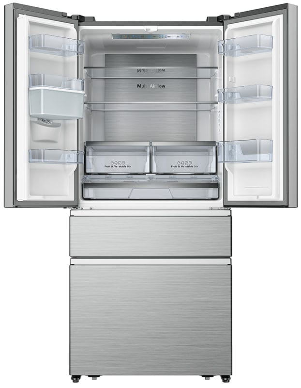 Avec sa contenance de 421 L, ce réfrigérateur multi-portes se dote en effet de la capacité d’un frigo américain. Ajoutez à cela le design de ce frigo en métal, s’intégrant parfaitement dans une cuisine contemporaine et moderne. Son petit plus ? Le distributeur d’eau intégré au frigidaire !