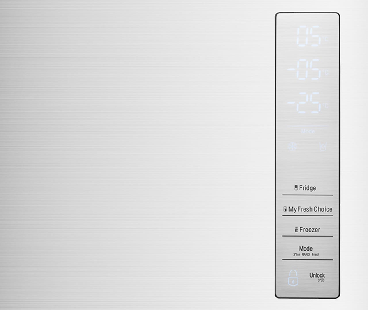 Vous pouvez facilement lire et modifier les paramètres de votre réfrigérateur avec l’élégant affichage à LED, que vous souhaitiez changer la température ou utiliser des paramètres supplémentaires tels que My Fresh Choice (Mon Choix Frais).