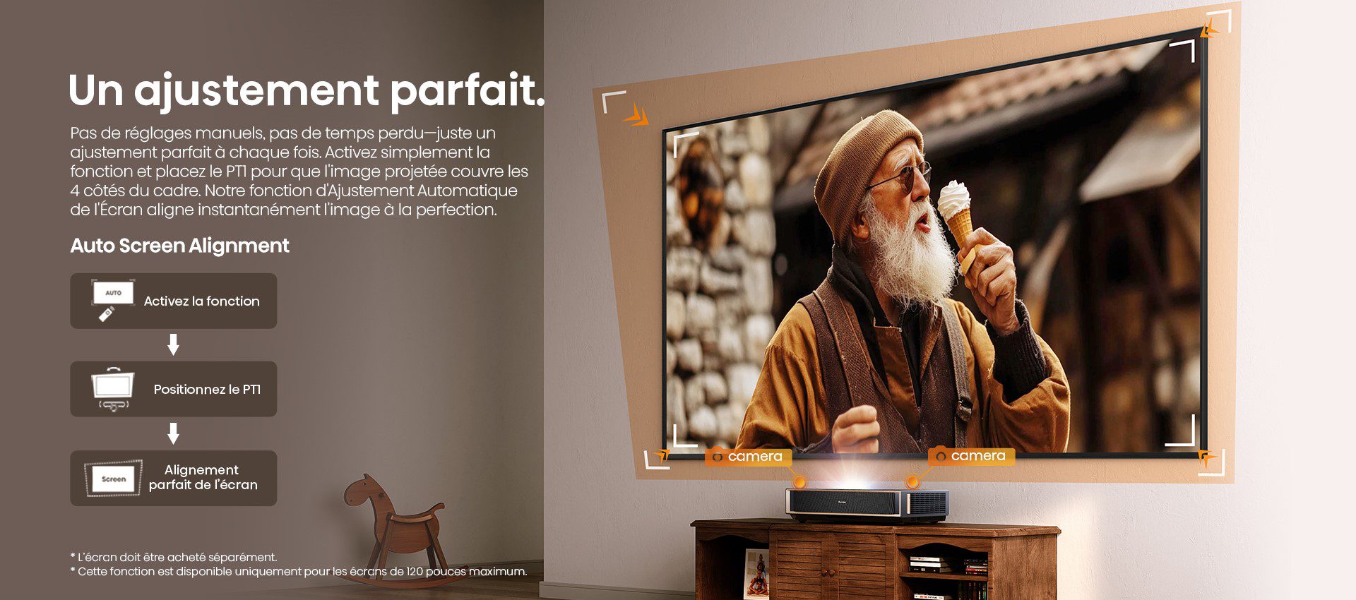 Grâce à l’Auto Screen Fit, à la mise au point automatique, à la correction géométrique (9 points) et à l’upscaling UHD, le PT1 ajuste automatiquement l’image pour une configuration sans effort. Il prend aussi en charge le MEMC pour des mouvements fluides, et propose des modes dédiés : cinéma, sport, jeu ou 3D.