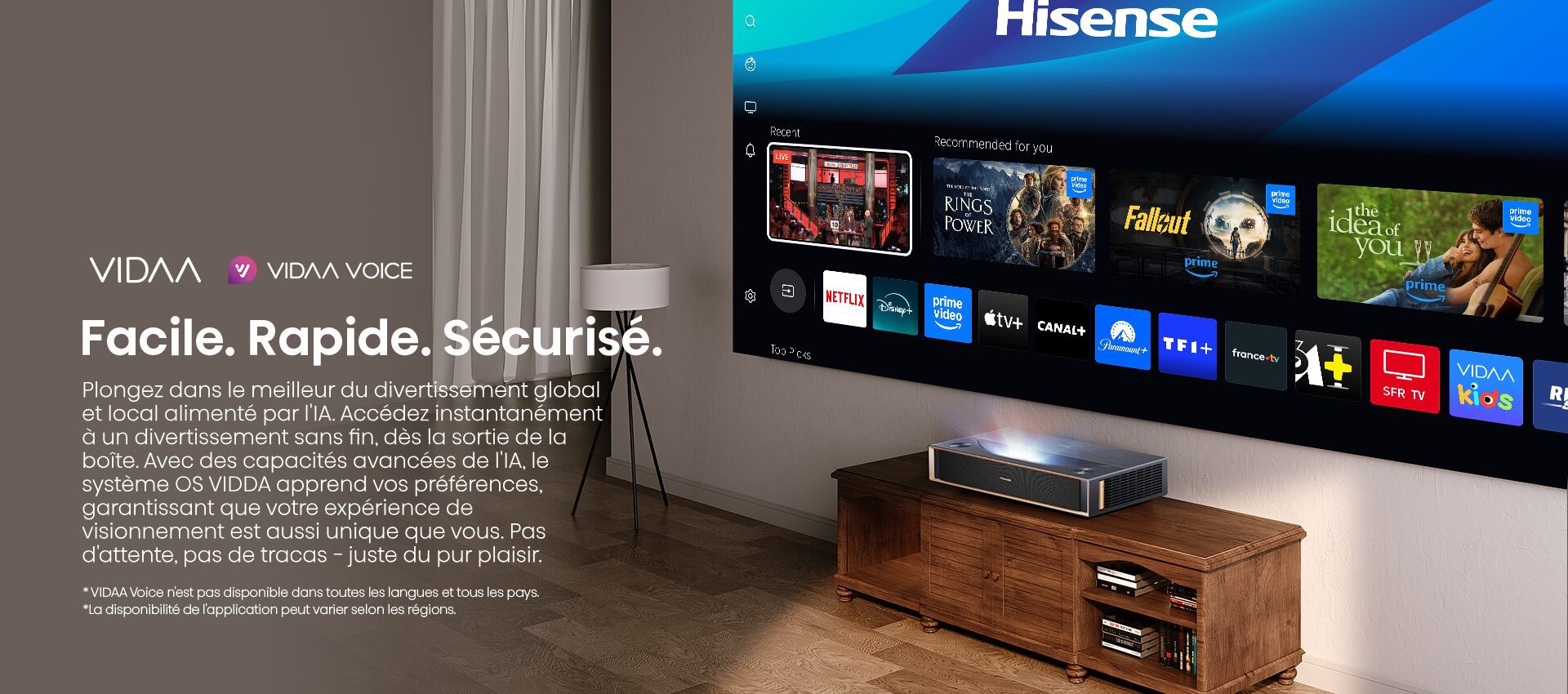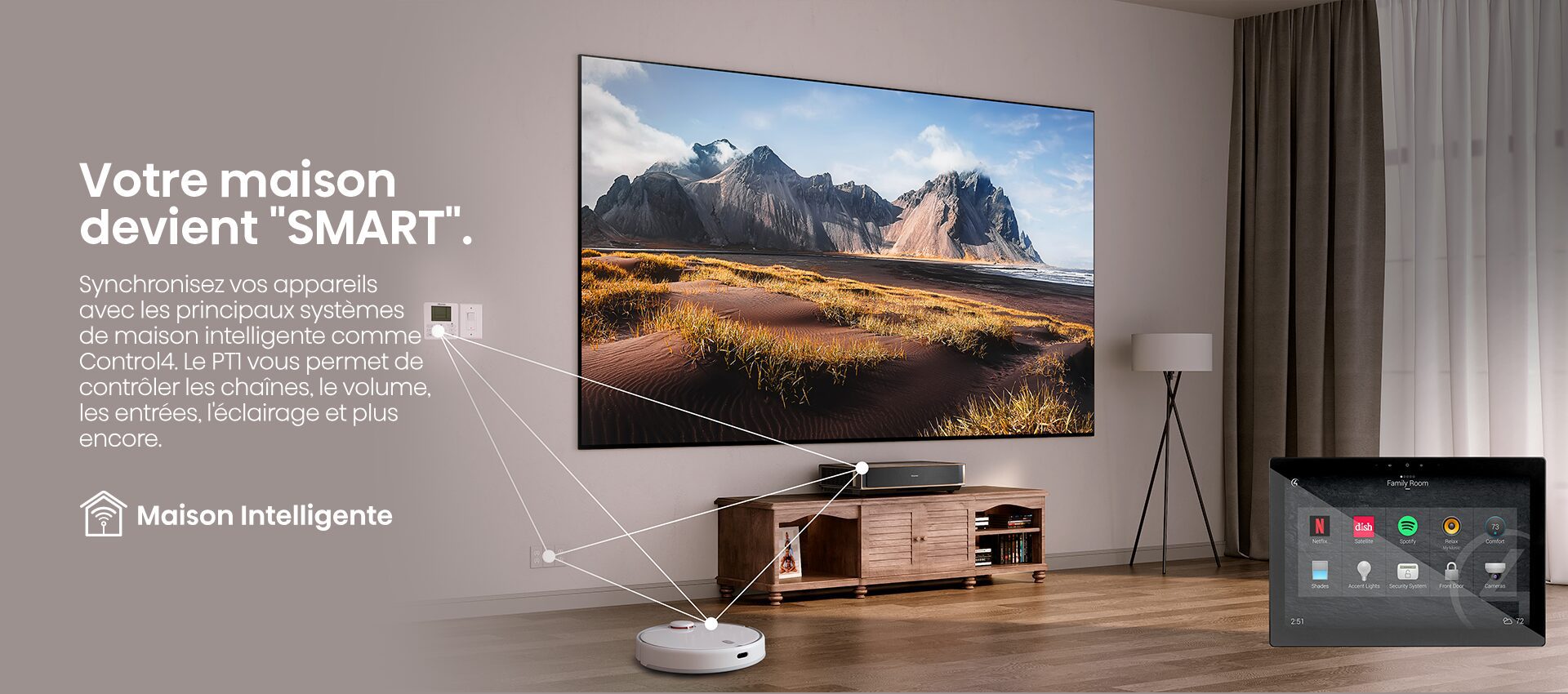 Équipé du système VIDAA U7, le PT1 donne accès à vos contenus préférés (Netflix, Prime Video, YouTube…) avec un démarrage rapide et une interface fluide. Il prend en charge AirPlay 2, Bluetooth, Wi-Fi 6e, DLNA, contrôle vocal (Alexa & VIDAA Voice) et même le protocole domotique Control4.