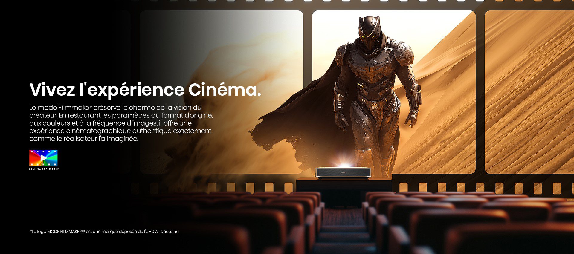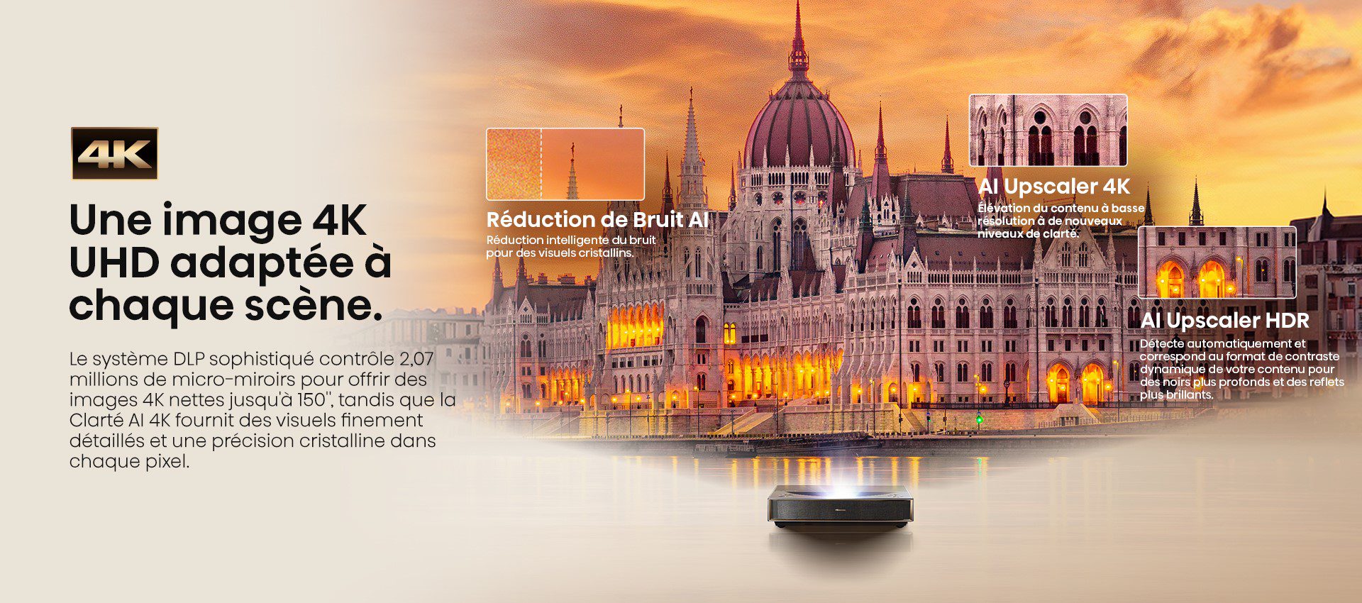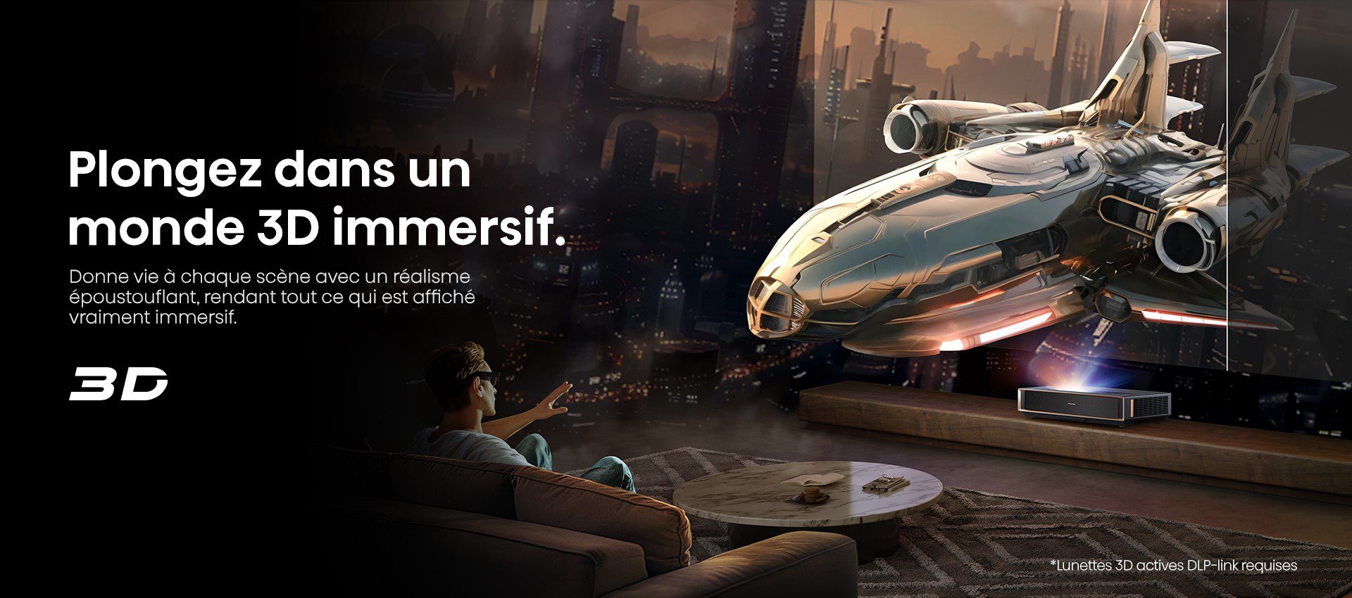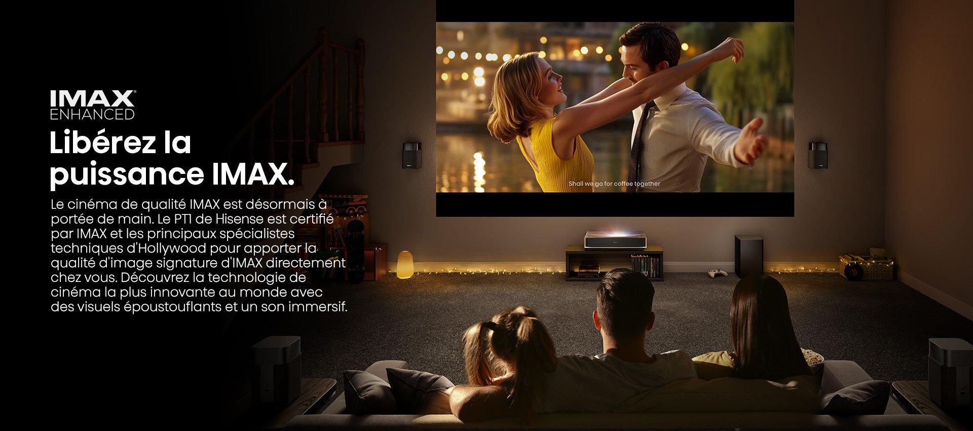 Le Hisense PT1 redéfinit l’expérience Home Cinema grâce à sa technologie laser TriChroma et sa projection ultra courte focale. Capable d’afficher une image de 80 à 150 pouces en 4K UHD, il transforme n’importe quel mur en écran géant, même dans les petits espaces. La certification IMAX Enhanced garantit une image spectaculaire, fidèle à la vision des créateurs.