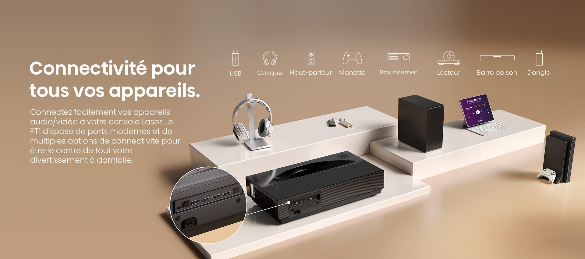 Avec 3 entrées HDMI (dont 2 HDMI 2.1 eARC), 2 ports USB, une sortie audio optique, un port Ethernet RJ45 et une compatibilité WiSa Ready, le PT1 s’intègre facilement dans n’importe quelle configuration. Tout est pensé pour une expérience fluide, connectée et hautement performante.
