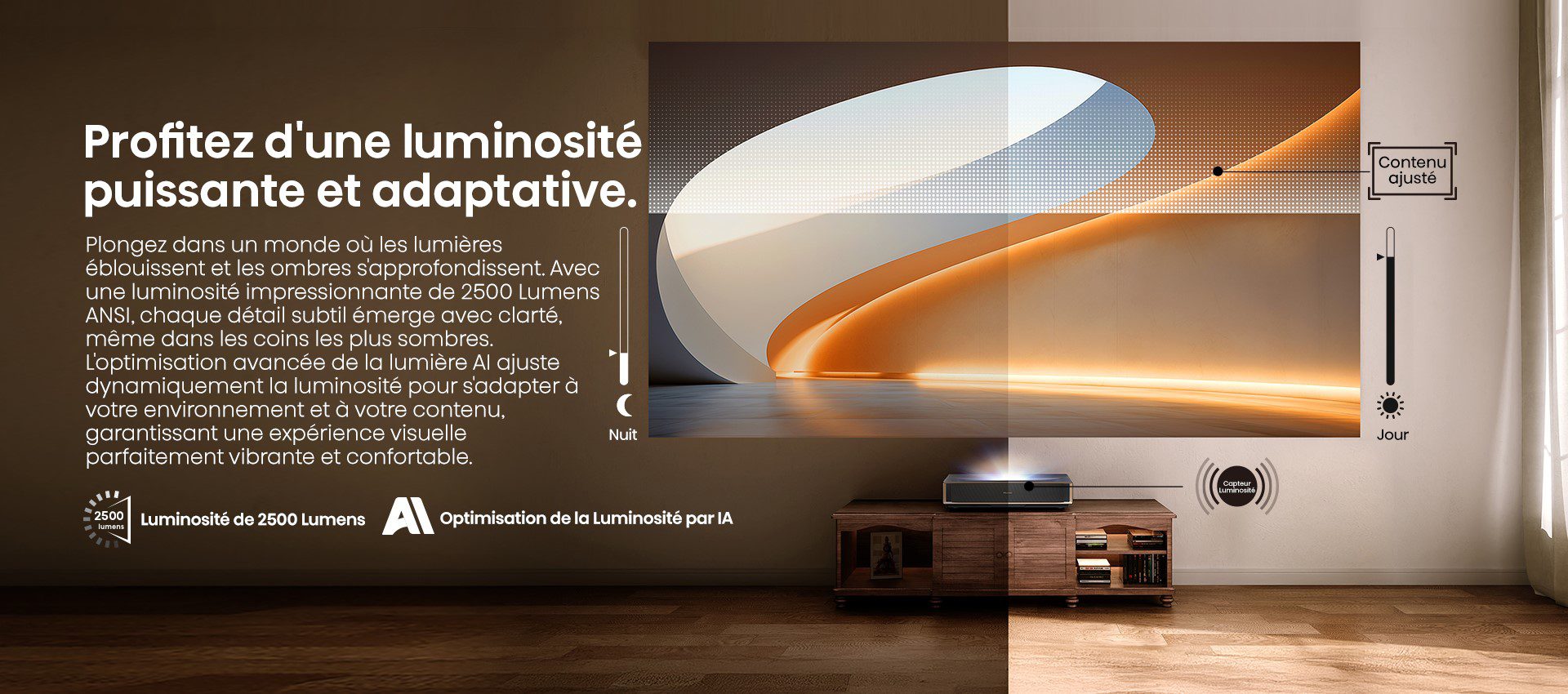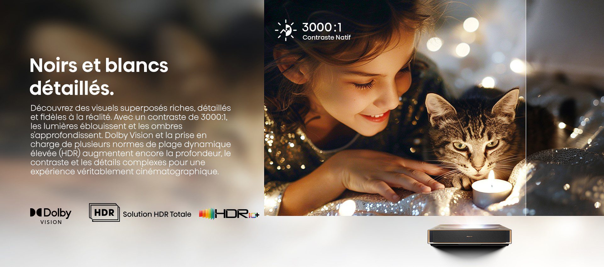 Le PT1 couvre 110 % de l’espace colorimétrique BT.2020 pour des couleurs d’une richesse exceptionnelle. Avec un contraste natif de 3000:1, une luminosité de 2500 lumens ANSI et le support des formats Dolby Vision, HDR10+ et HLG, il restitue chaque détail, du plus lumineux au plus sombre, avec un réalisme bluffant.