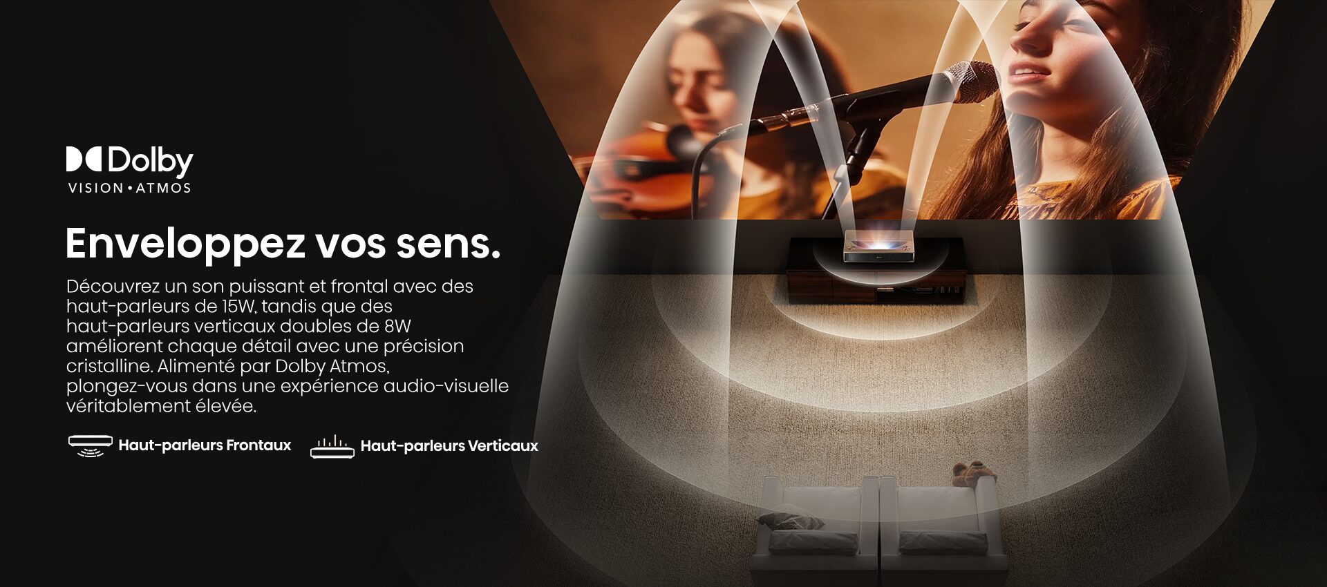 Le PT1 intègre une barre de son stéréo avec 4 haut-parleurs (2x15W + 2x8W) compatibles Dolby Atmos et DTS:X, offrant un son ample et immersif sans système audio externe. Le mode audio est personnalisable selon vos envies (musique, voix, cinéma, nuit…).