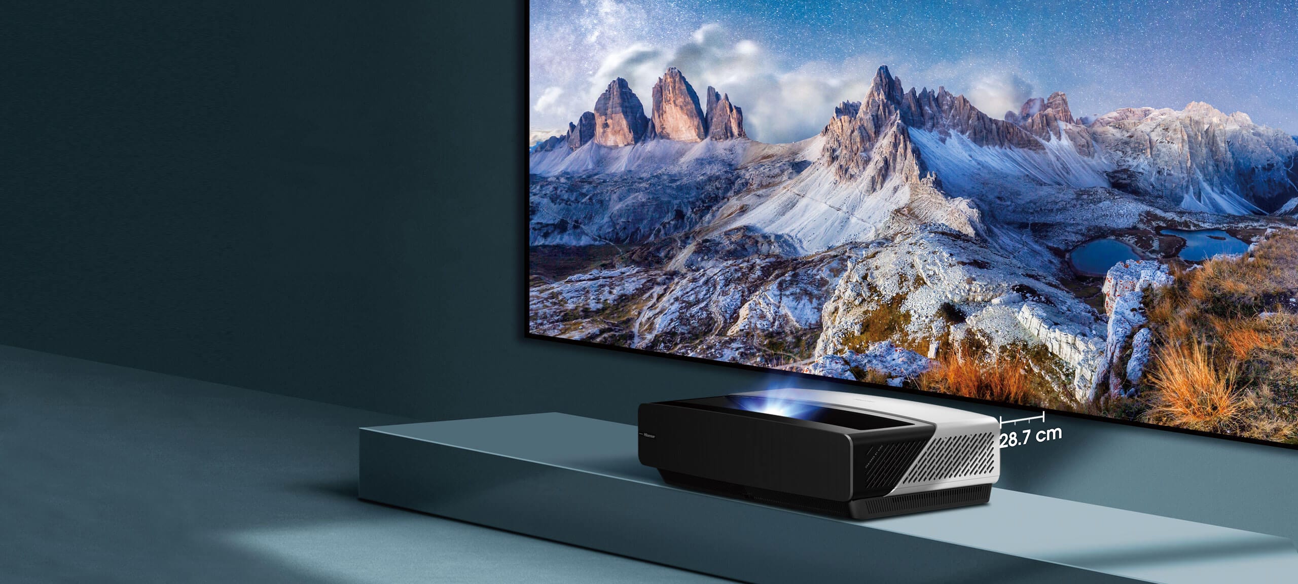 2. La distance entre le laser TV et le mur ne doit pas dépasser 28,7cm pour assurer une parfaite projection de l'image à la correction dimension sur l'écran.