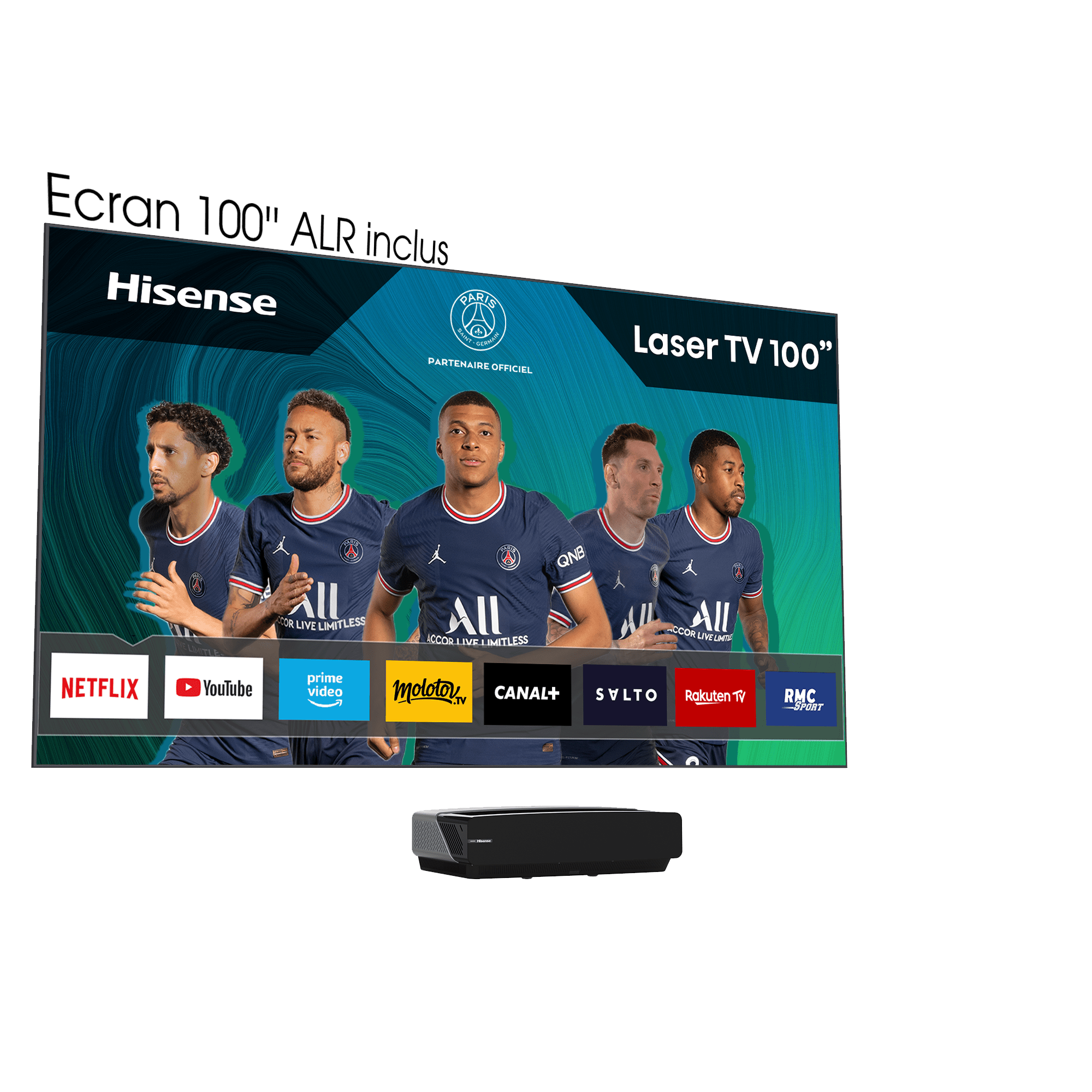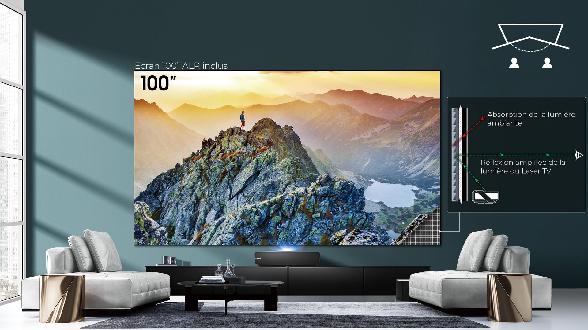 Avec son ultra-courte focale, le Laser TV projette une image 4K coloré et lumineuse sur un écran de projection de 2m54 de diagonal, conçu pour être regardé dans n’importe quelle pièce de la maison. L’image est lumineuse et détaillée, quel que soit le type d’éclairage, vous permettant de profiter d’une expérience télévisuelle exceptionnelle quelque soit les conditions d’utilisation.
