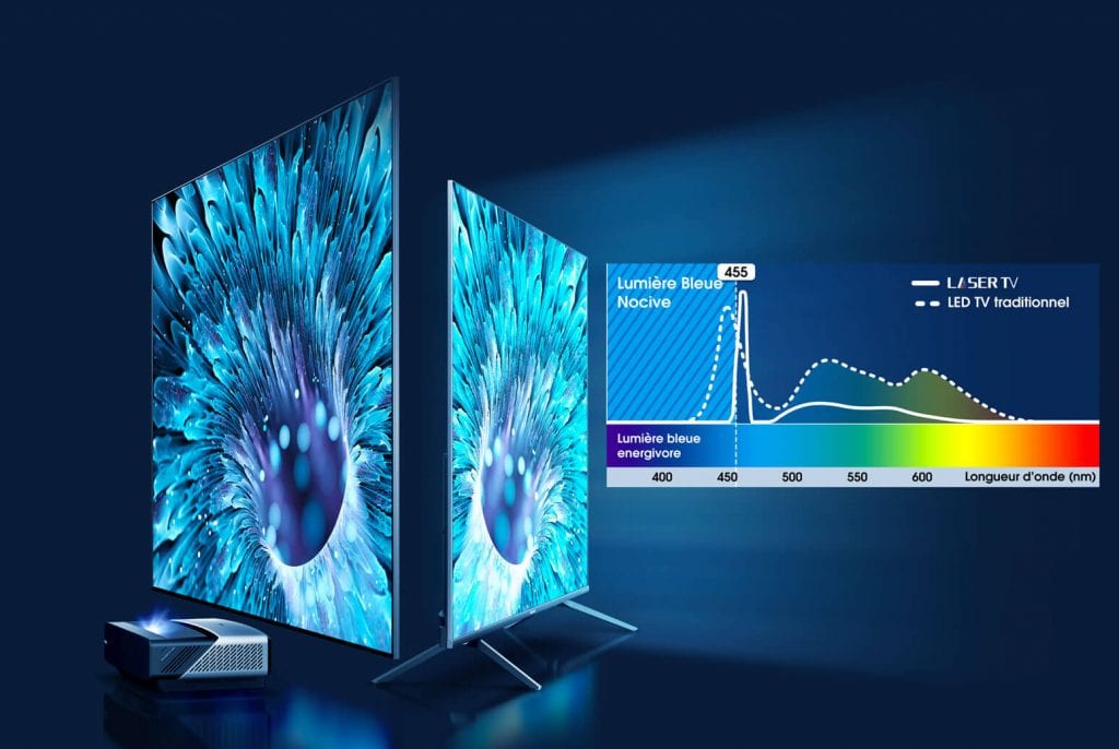 Le Laser TV utilise comme source de lumière un laser bleue pour obtenir des images extrêmement nettes et précises. Cette technologie Laser évite la distorsion de la lumière tout en offrant une expérience visuelle beaucoup plus naturelle. La durée de vie d’un laser est de 25 000 heures, contre environ 2 000 heures pour des projecteur à ampoule classique.
