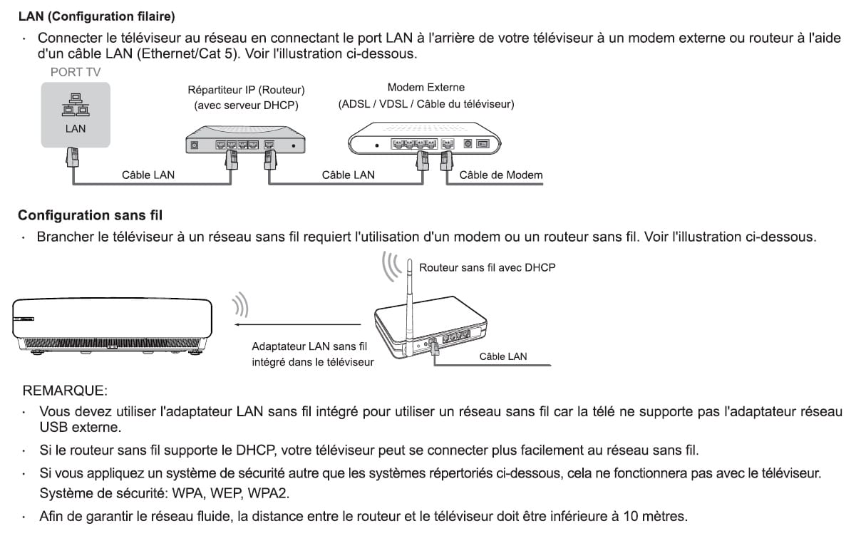Pour une utilisation optimale de la bande passante fournie par votre réseau, nous vous recommandons de raccorder le laser TV sur un porte Ethernet libre de votre routeur (avec configuration DHCP activé).