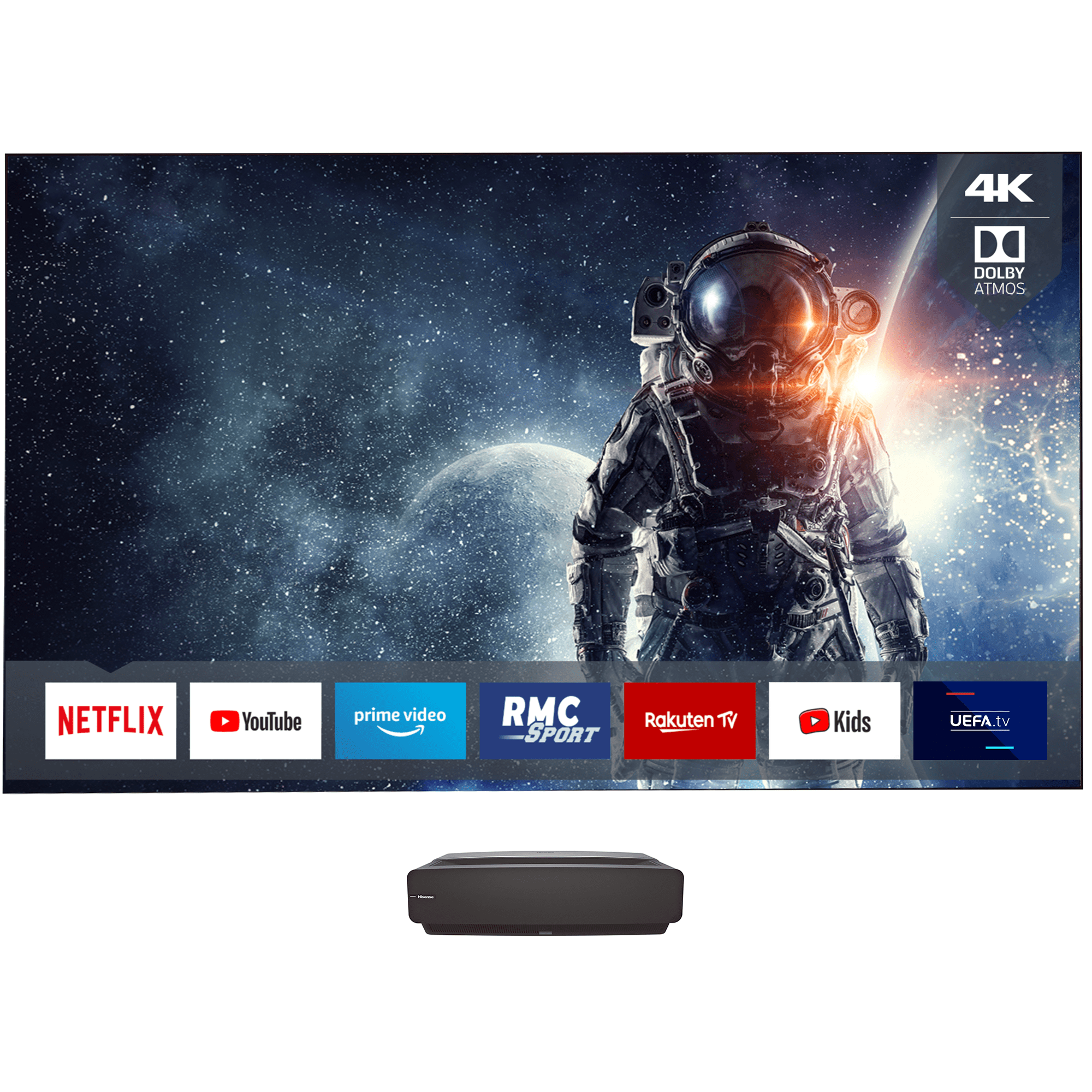 Avec son ultra-courte focale, le Laser TV projette une image 4K coloré et lumineuse sur un écran de projection de 2m54 de diagonal, conçu pour être regardé dans n’importe quelle pièce de la maison. L’image est lumineuse et détaillée, quel que soit le type d’éclairage, vous permettant de profiter d’une expérience télévisuelle exceptionnelle quelque soit les conditions d’utilisation.