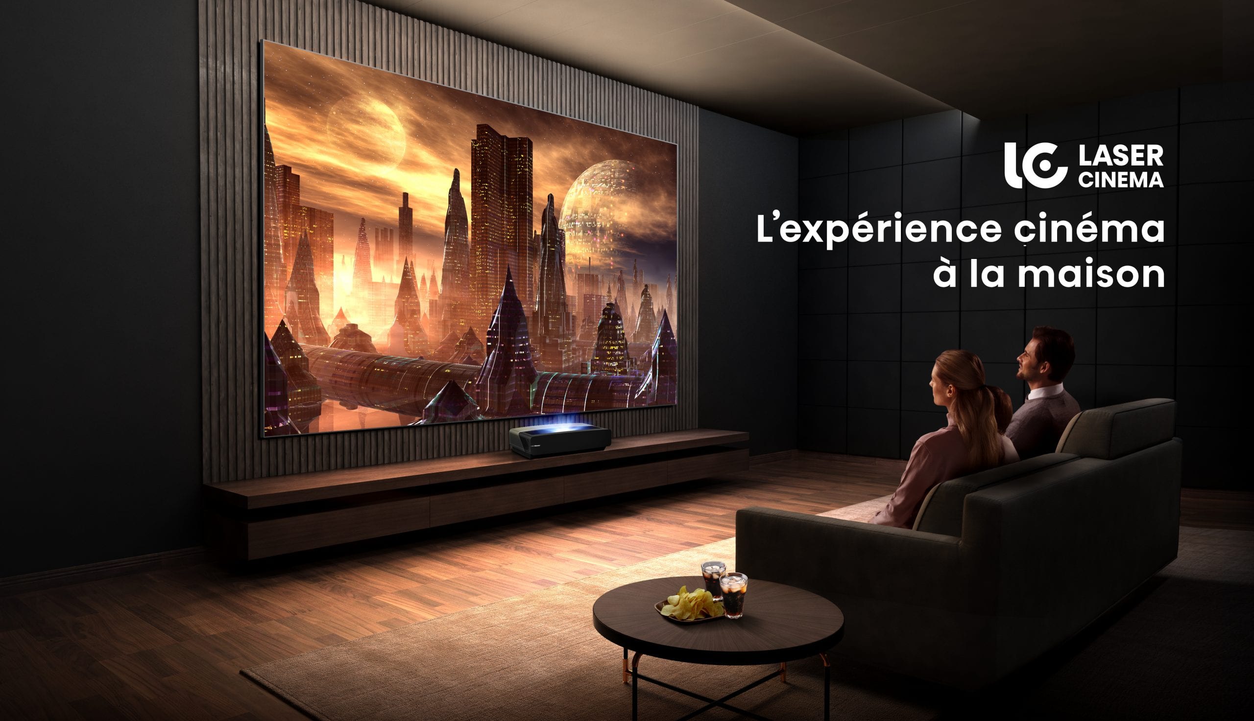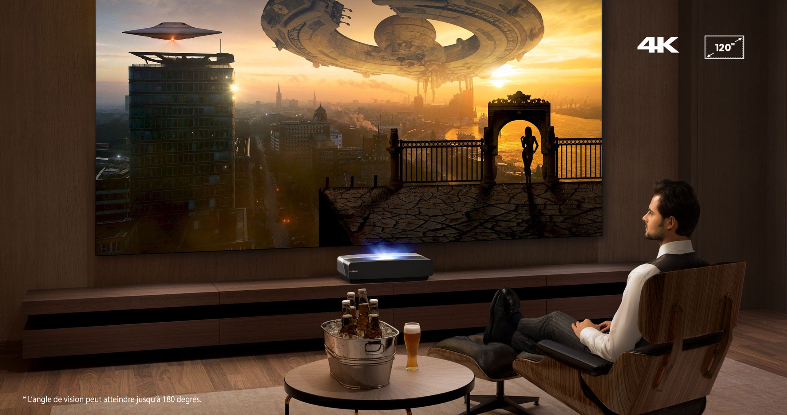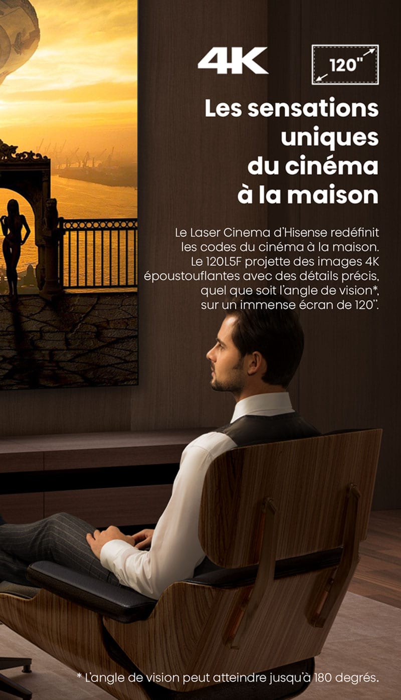 Le Laser Cinema d’Hisense redéfinit les codes du cinéma à la maison. Le 120L5F projette des images 4K époustouflantes avec des détails précis, quel que soit l’angle de vision*, sur un immense écran de 120’’.