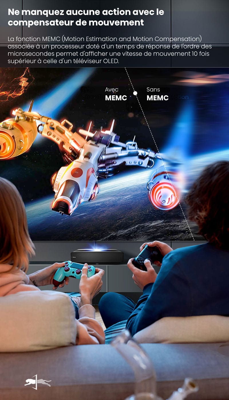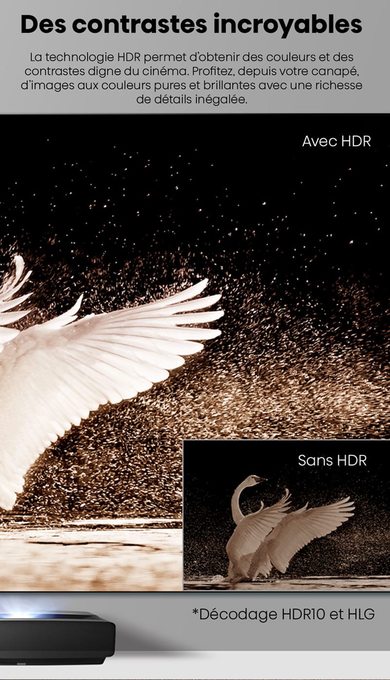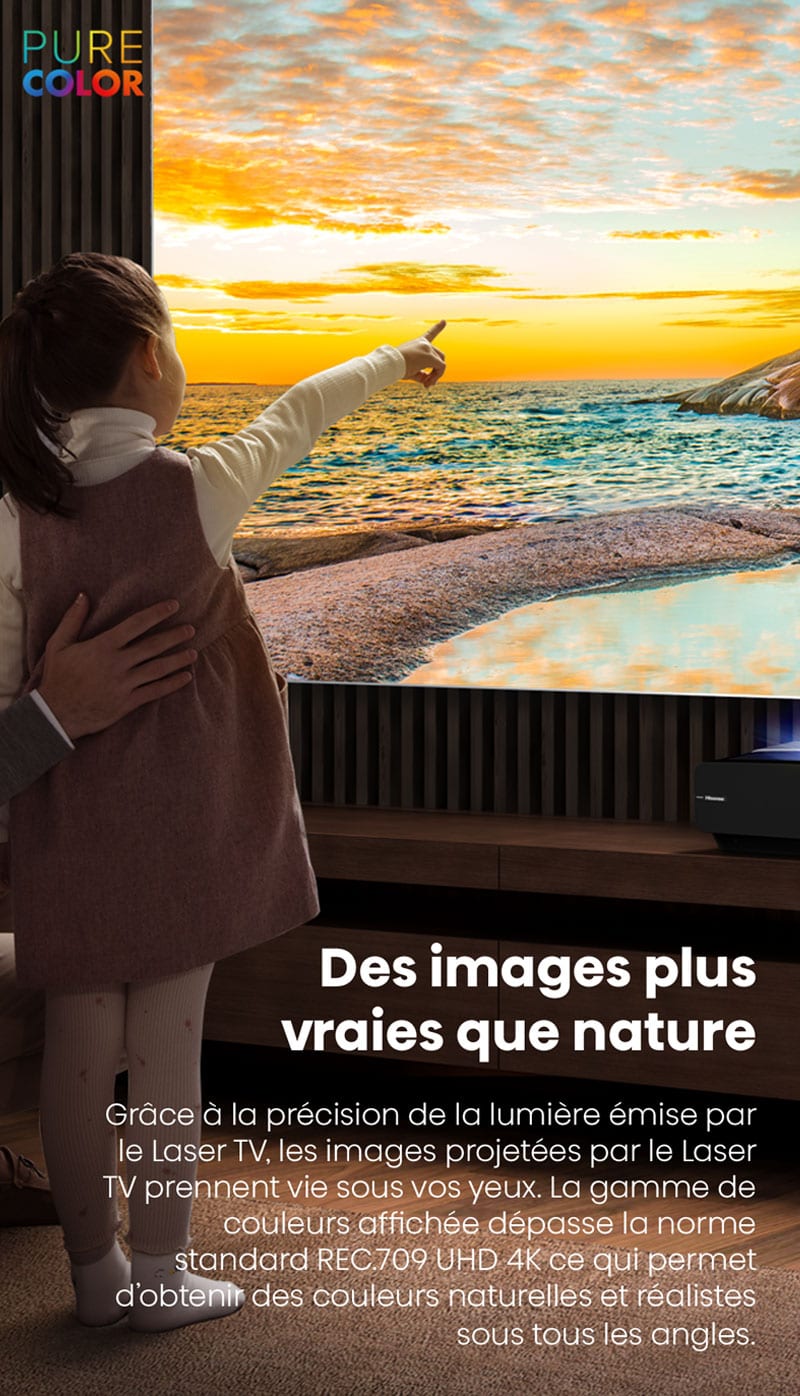 Grâce à la précision de la lumière émise par le Laser TV, les images projetées par le Laser TV prennent vie sous vos yeux. La gamme de couleurs affichée dépasse la norme standard REC.709 UHD 4K ce qui permet d’obtenir des couleurs naturelles et réalistes sous tous les angles.