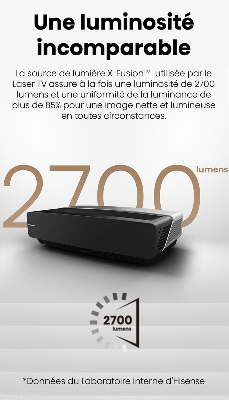 La source de lumière X-FusionTM utilisée par le Laser TV assure à la fois une luminosité de 2700 lumens et une uniformité de la luminance de plus de 85% pour une image nette et lumineuse en toutes circonstances.