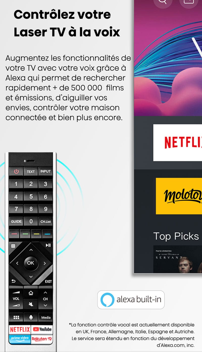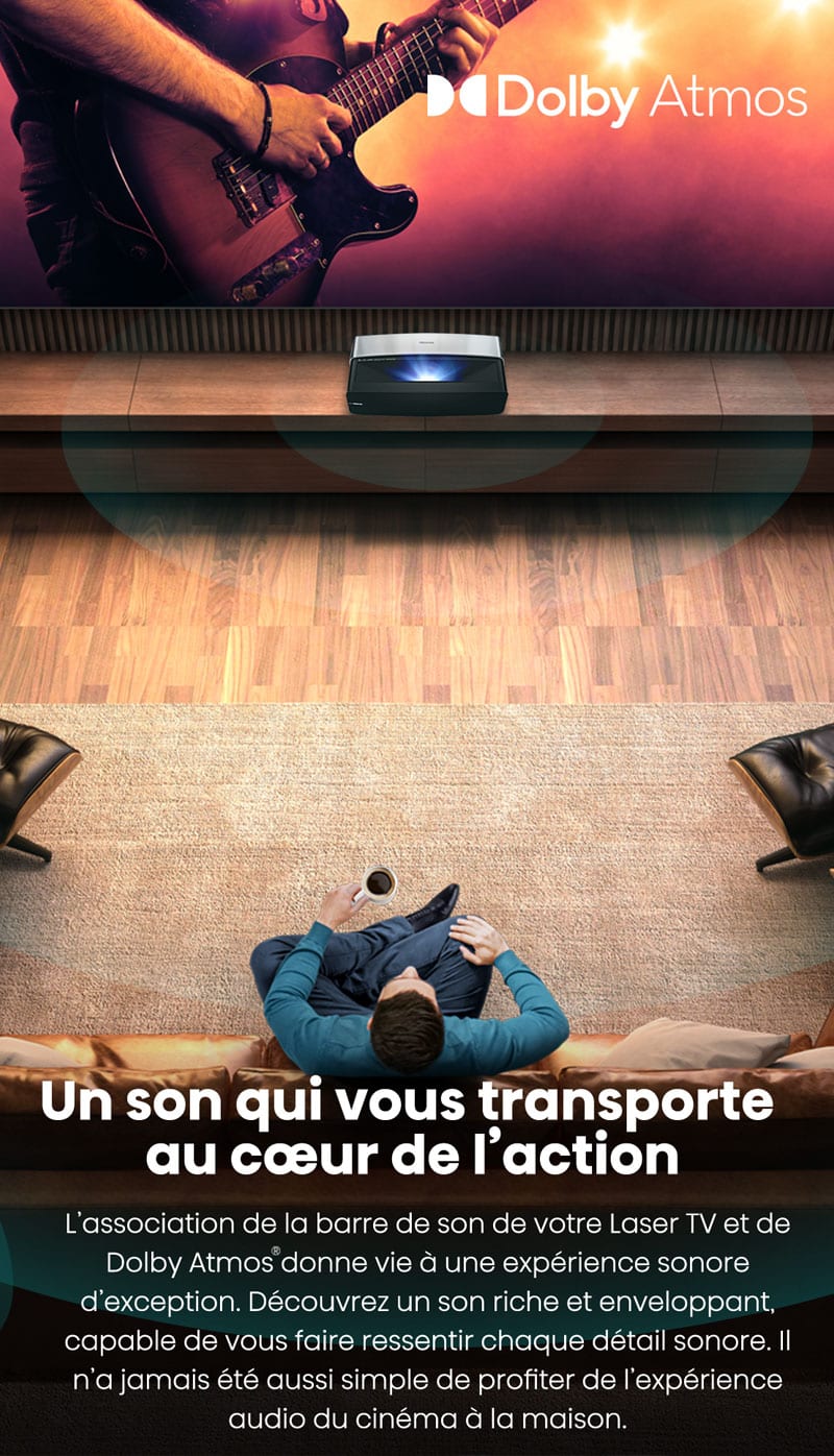 L’association de la barre de son de votre Laser TV et de Dolby Atmos donne vie à une expérience sonore d’exception. Découvrez un son riche et enveloppant, capable de vous faire ressentir chaque détail sonore. Il n’a jamais été aussi simple de profiter de l’expérience audio du cinéma à la maison.