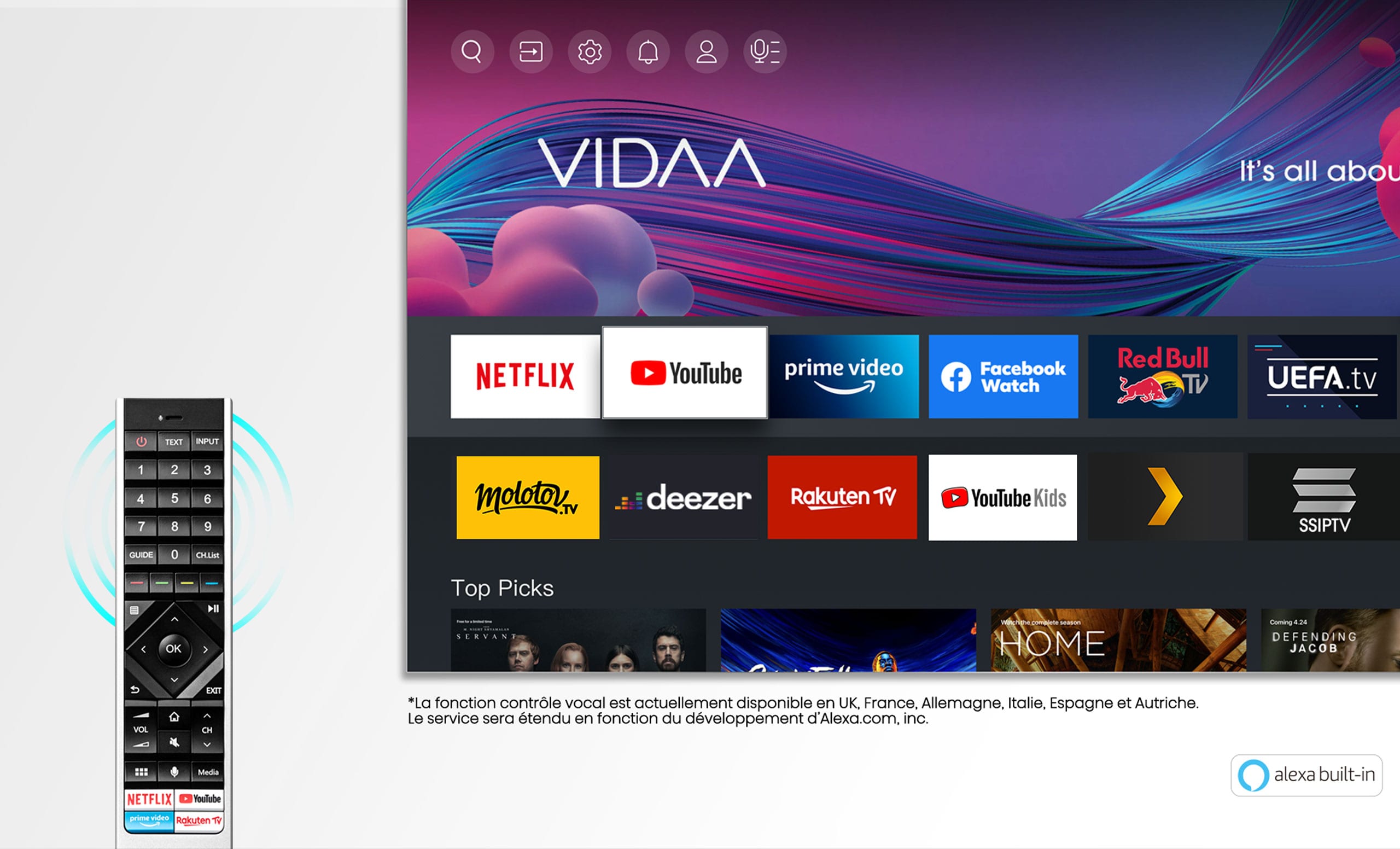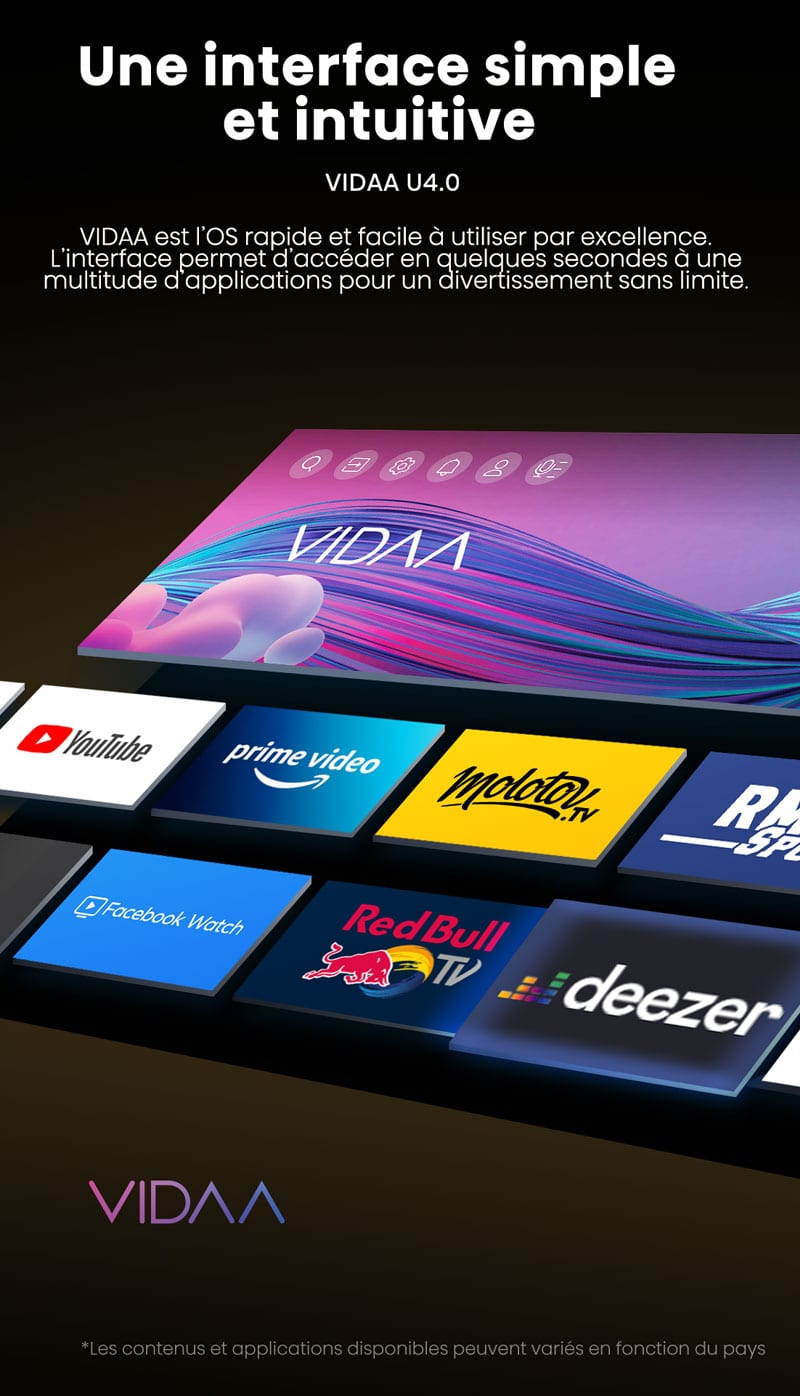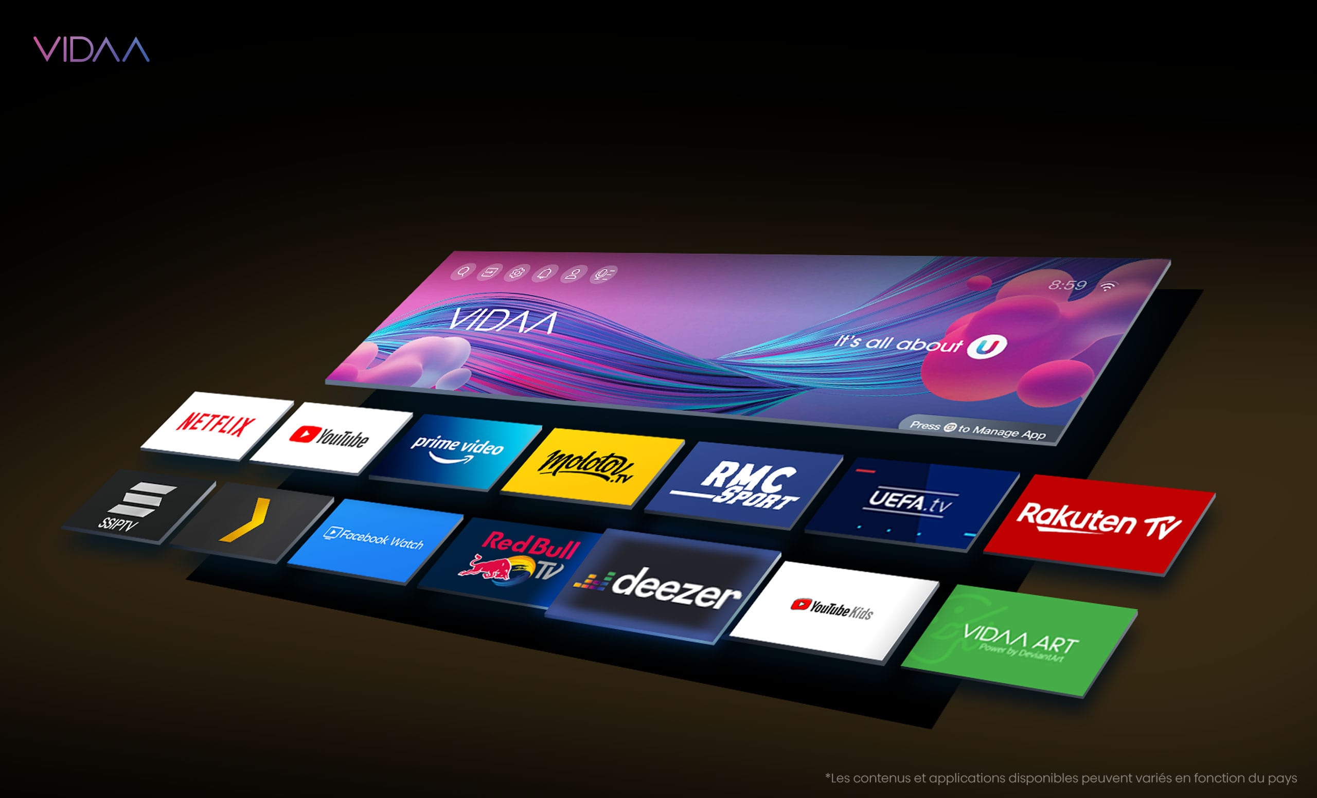 VIDAA est l’OS rapide et facile à utiliser par excellence. L’interface permet d’accéder en quelques secondes à une multitude d’applications pour un divertissement sans limite.