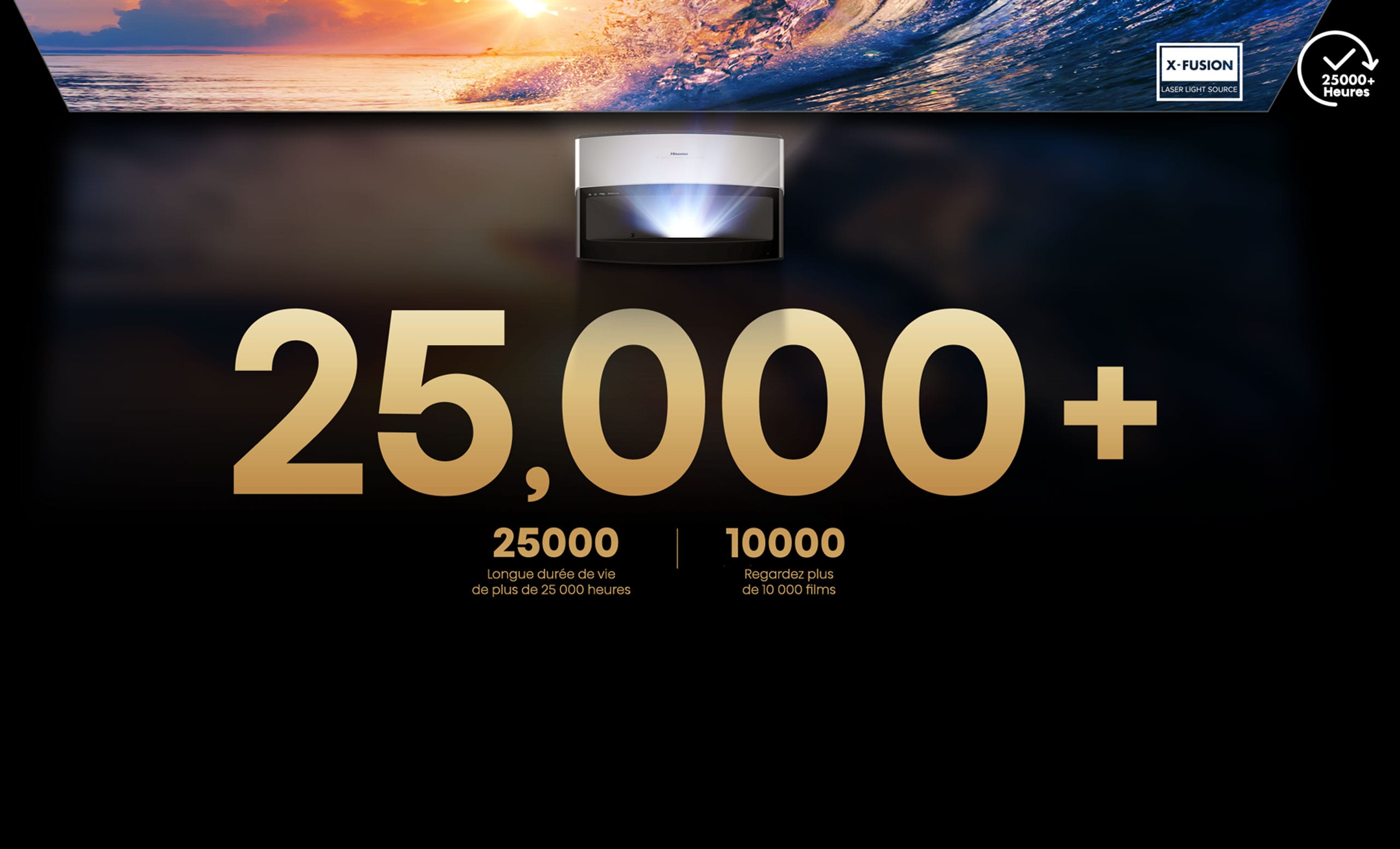 La technologie X-FusionTM utilise une source de lumière laser précise permettant de délivrer plus de 25 000 heures de divertissements, ce qui correspond au visionnage de plus de 10 000 films (durée estimée des films 2 heures).