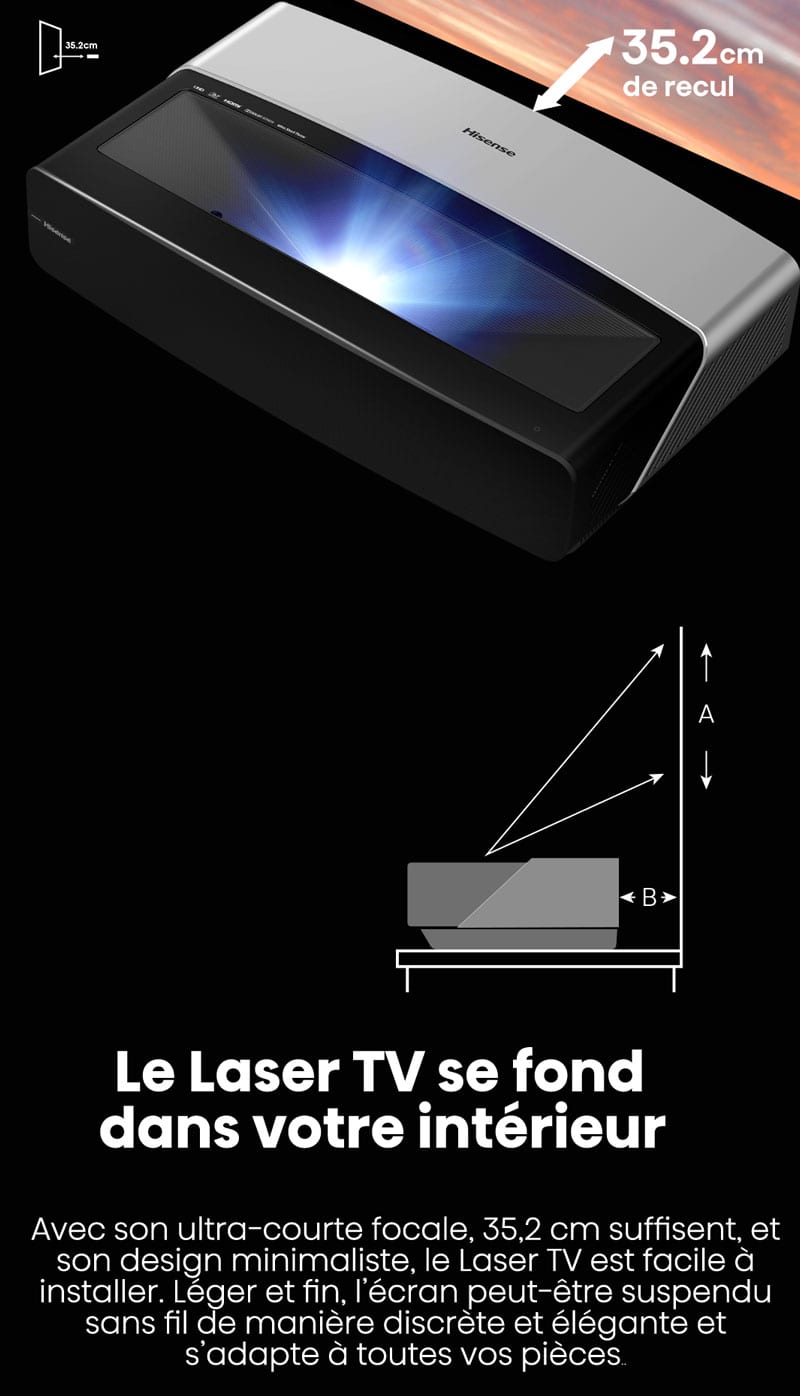 Avec son ultra-courte focale, 35,2 cm suffisent, et son design minimaliste, le Laser TV est facile à installer. Léger et fin, l’écran peut-être suspendu sans fil de manière discrète et élégante et s’adapte à toutes vos pièces.