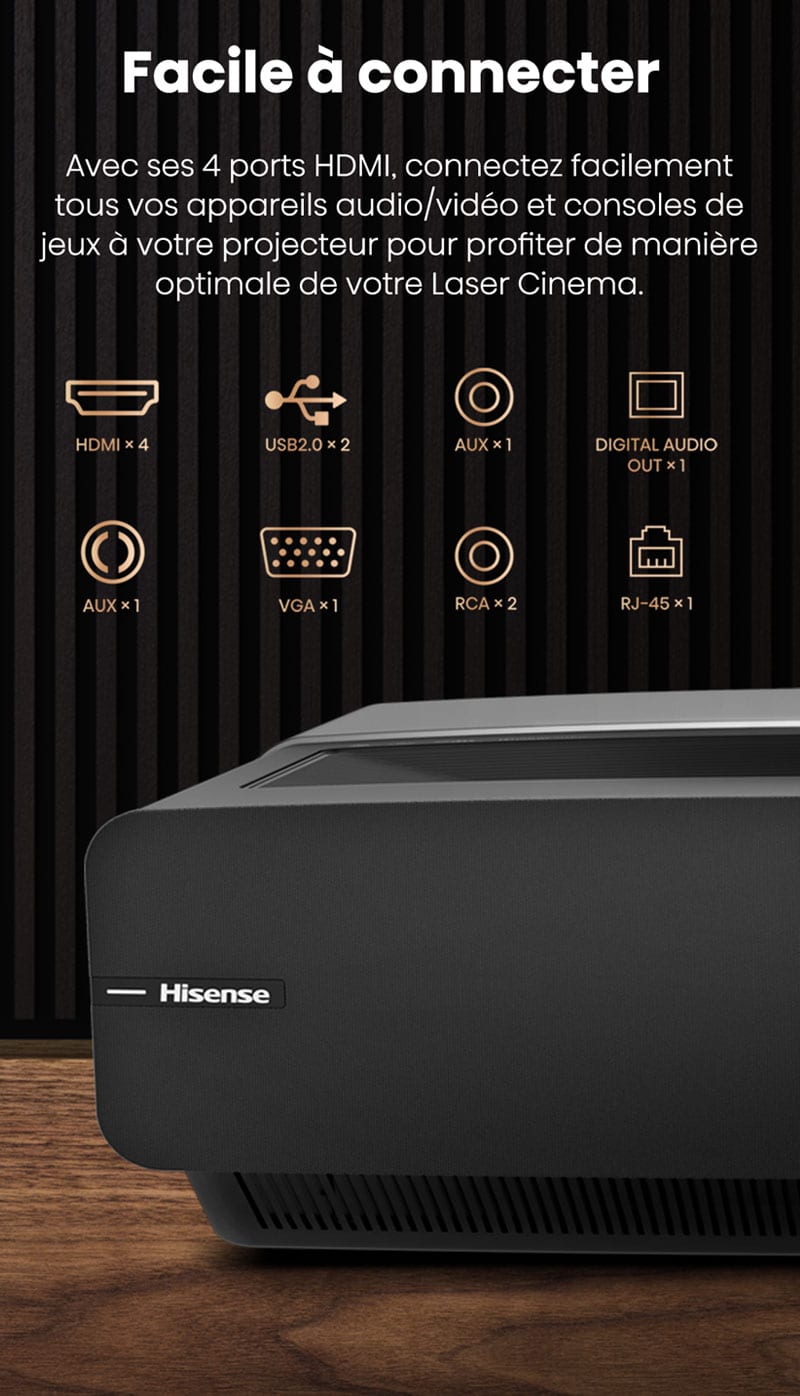 Avec ses 4 ports HDMI, connectez facilement tous vos appareils audio/vidéo et consoles de jeux à votre projecteur pour profiter de manière optimale de votre Laser Cinema.