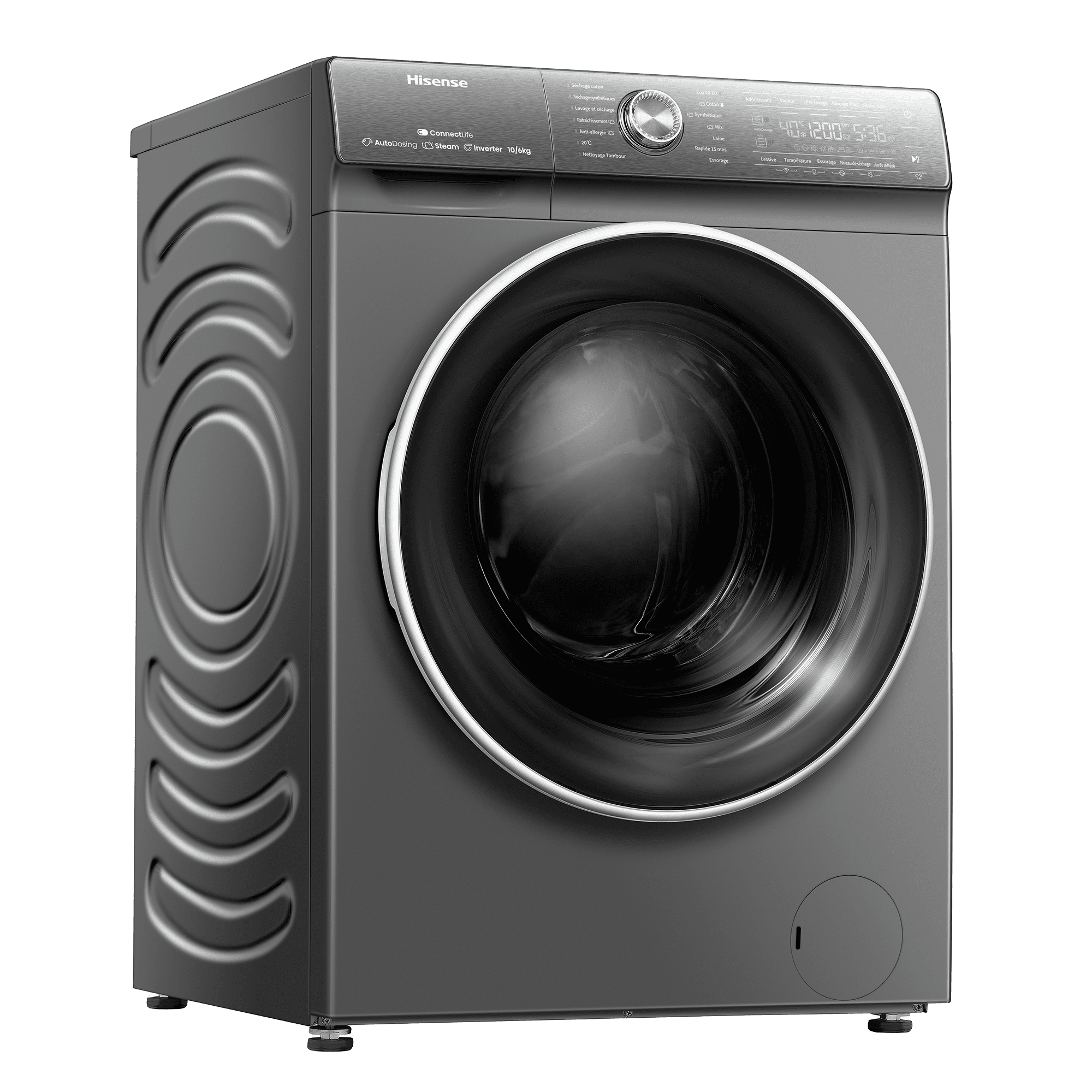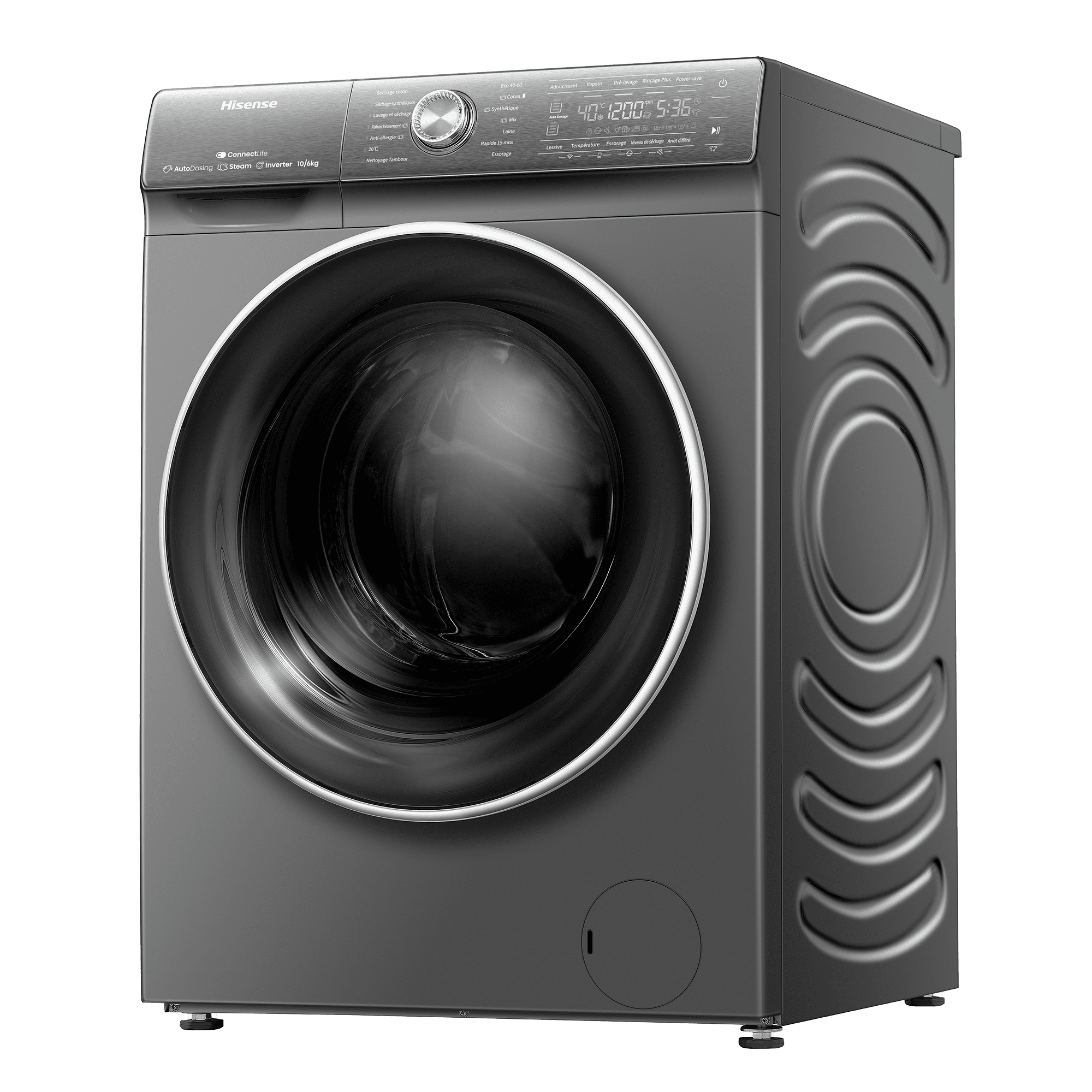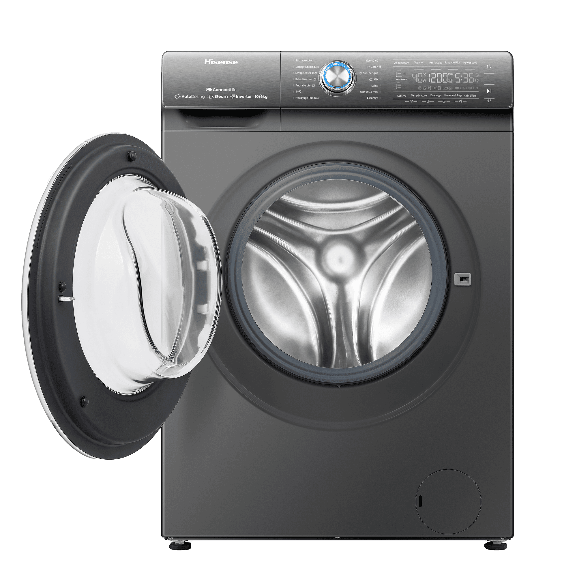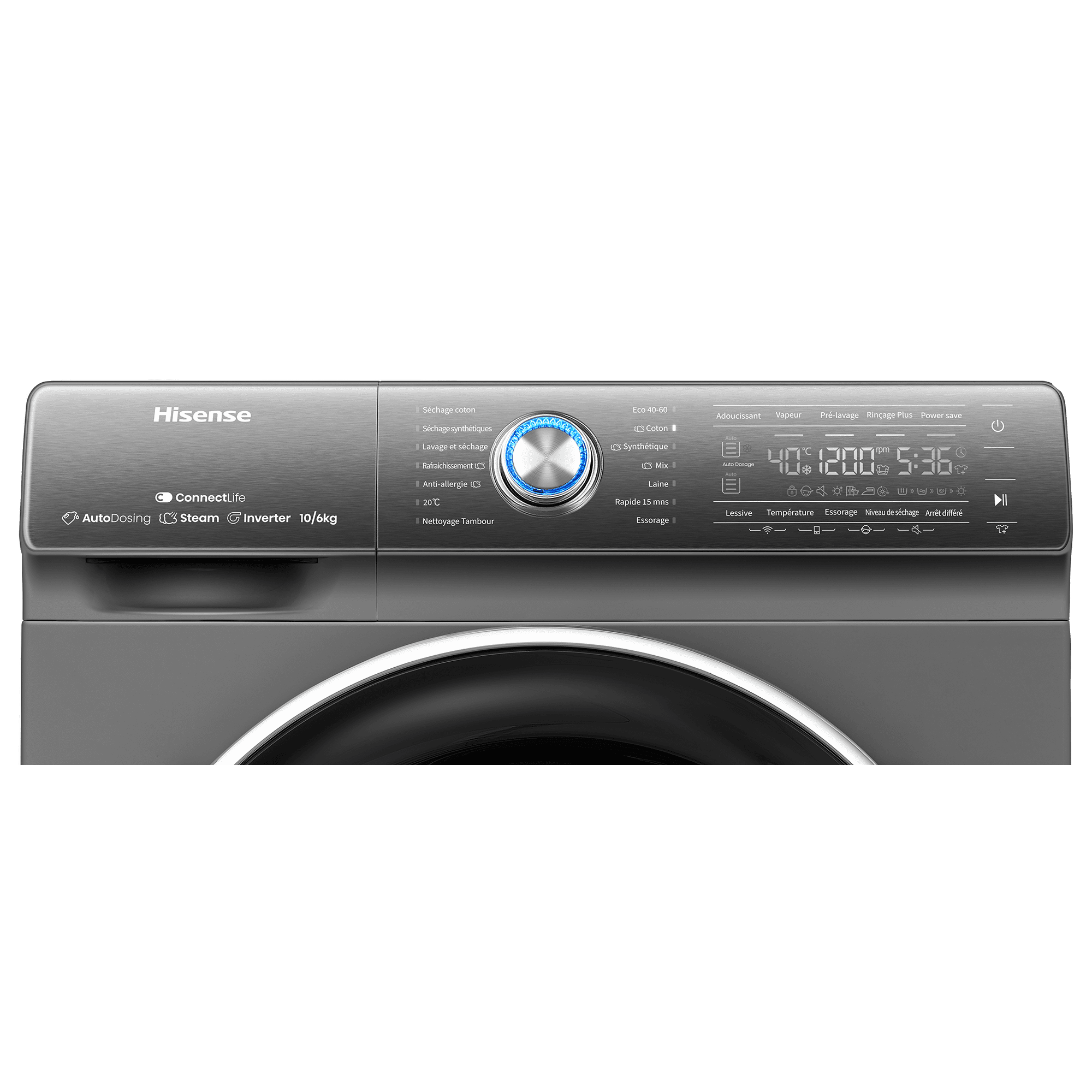 ProgrammesCoton, Synthétiques, Laine, Rapide 15 mins, Mix, Spécial bébé , Soie / Délicat, Lavage & séchage en 60', Séchage coton, Séchage synthétiques, Nettoyage du tambour, Rinçage + Essorage, Essorage