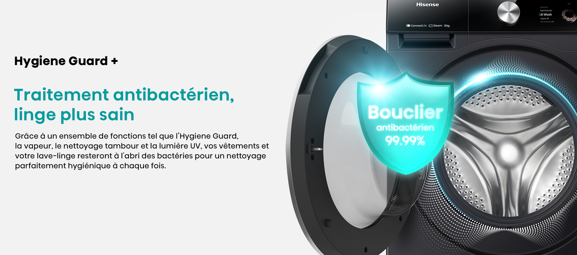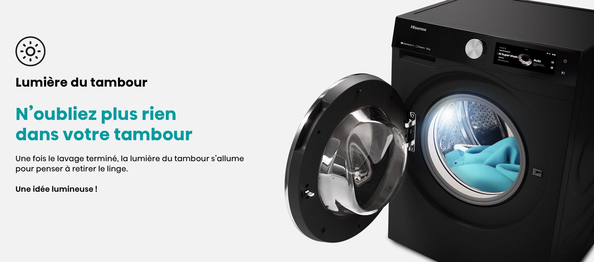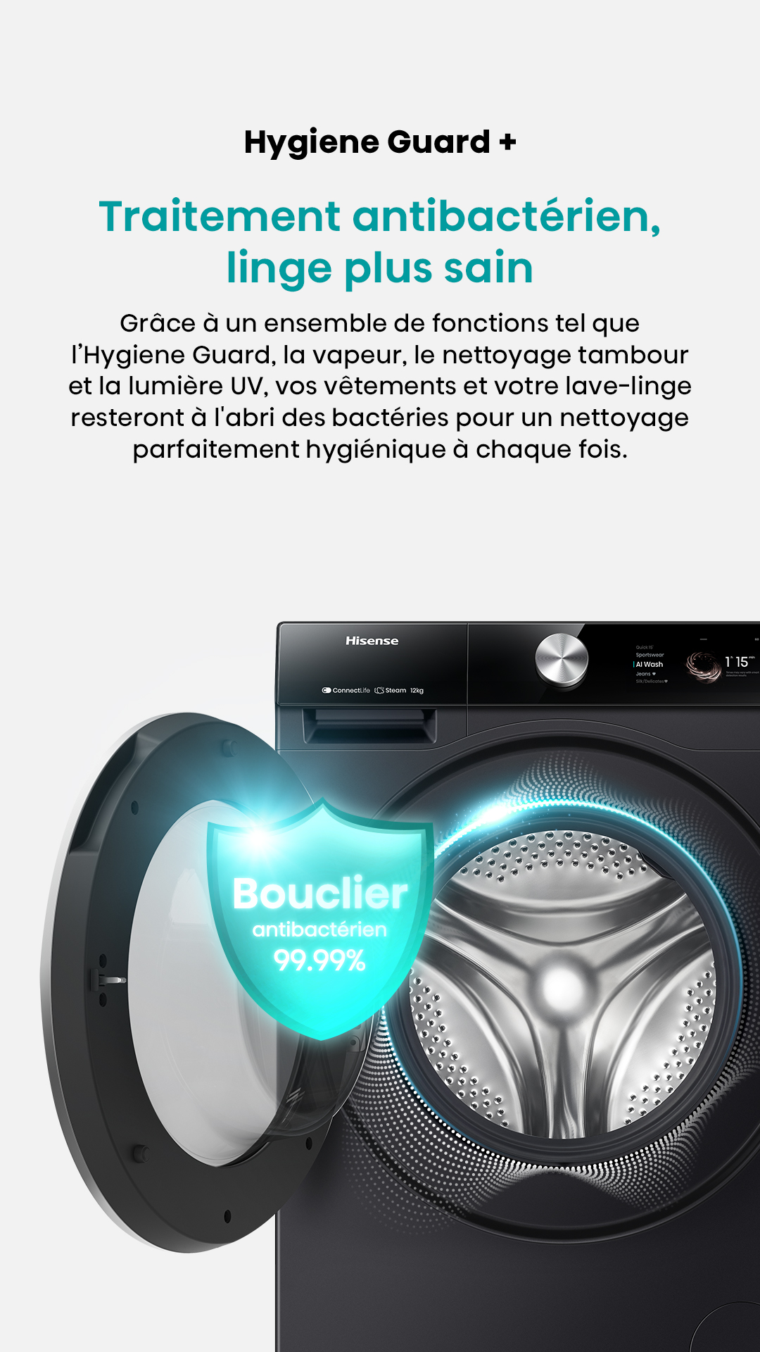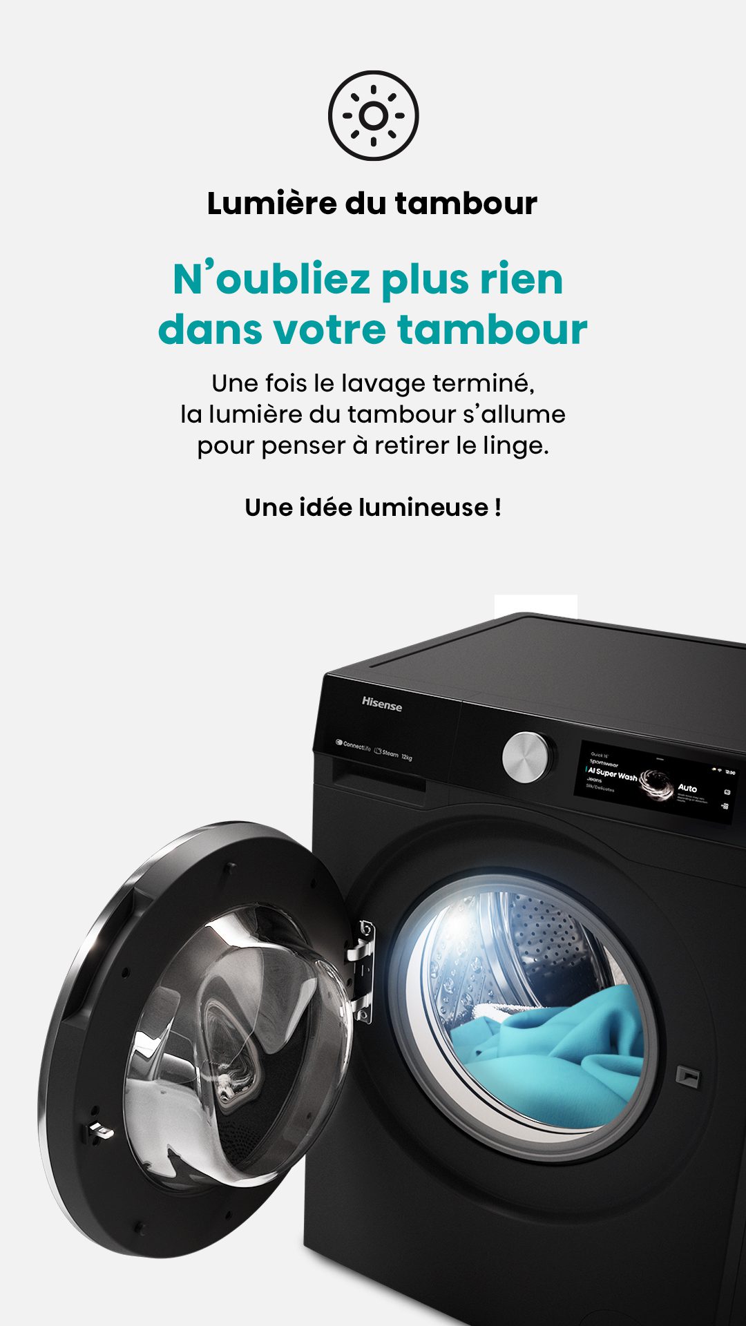 ProgrammesCoton, Coton Eco, Laine, Mix, Textile Sport, Délicat, Spécial bébé, Couleurs foncées, Couette, Rapide 15 mins, Rinçage + Essorage, Essorage, Nettoyage du tambour, AI Super Wash