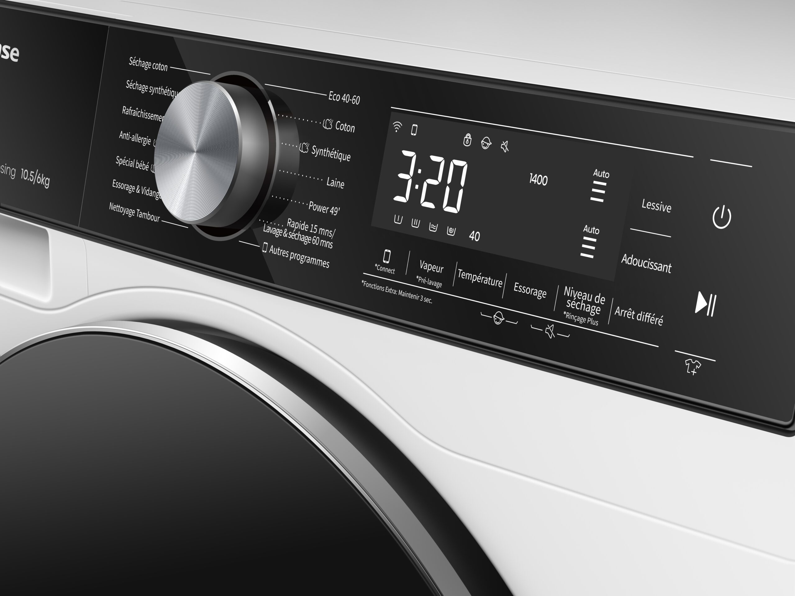 ProgrammesCoton, Synthétiques, Laine, Rapide 15 mins, Mix, Jeans, Peaux Sensibles, Spécial bébé , Soie / Délicat, Lavage & séchage en 60', Rafraichissement, Séchage coton, Séchage synthétiques, Nettoyage du tambour, Rinçage + Essorage, Essorage