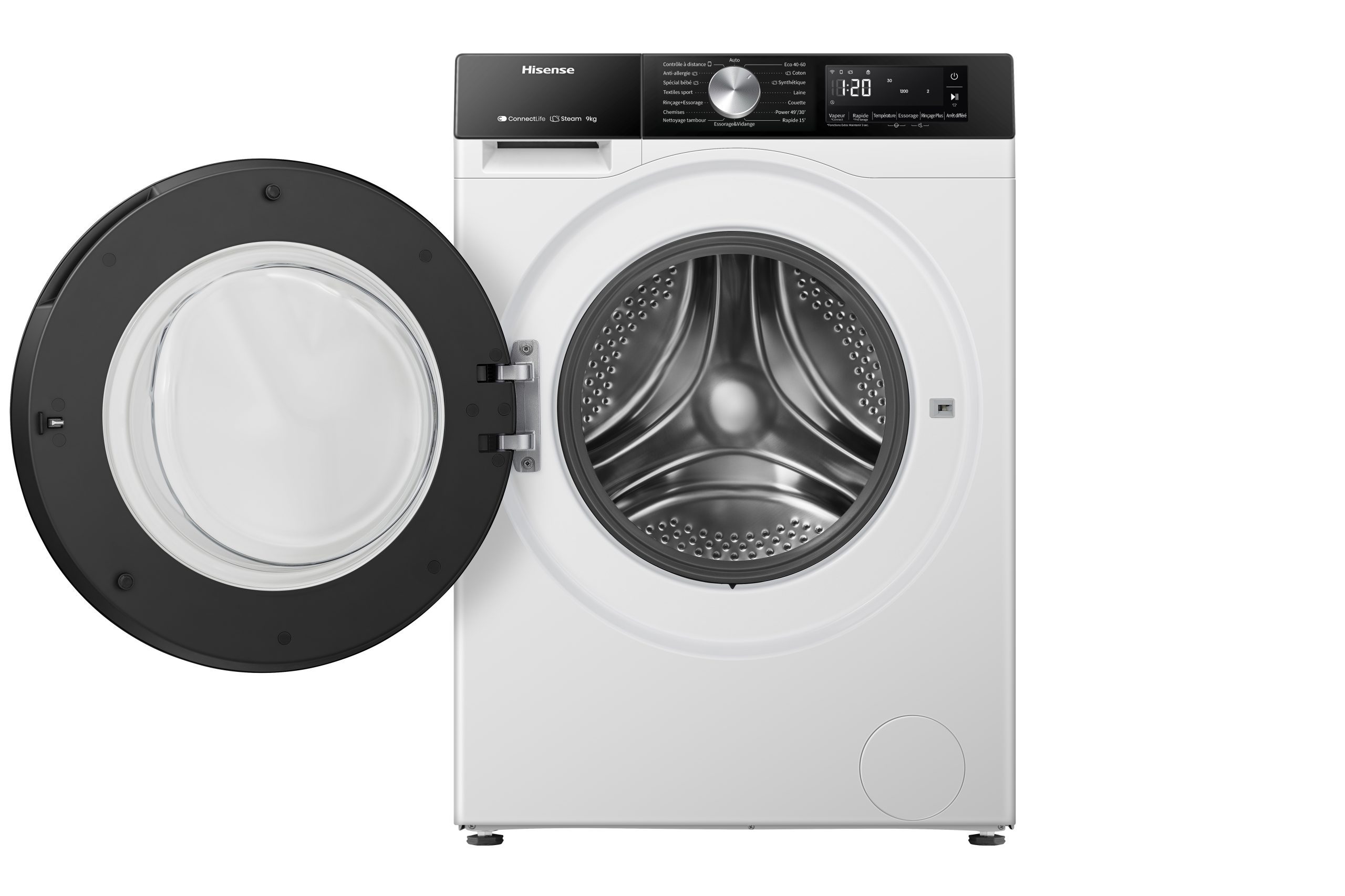 ProgrammesCoton, Coton Eco, Laine, Mix, Textile Sport, Délicat, Spécial bébé, Couleurs foncées, Couette, Rapide 15 mins, Rinçage + Essorage, Essorage, Nettoyage du tambour