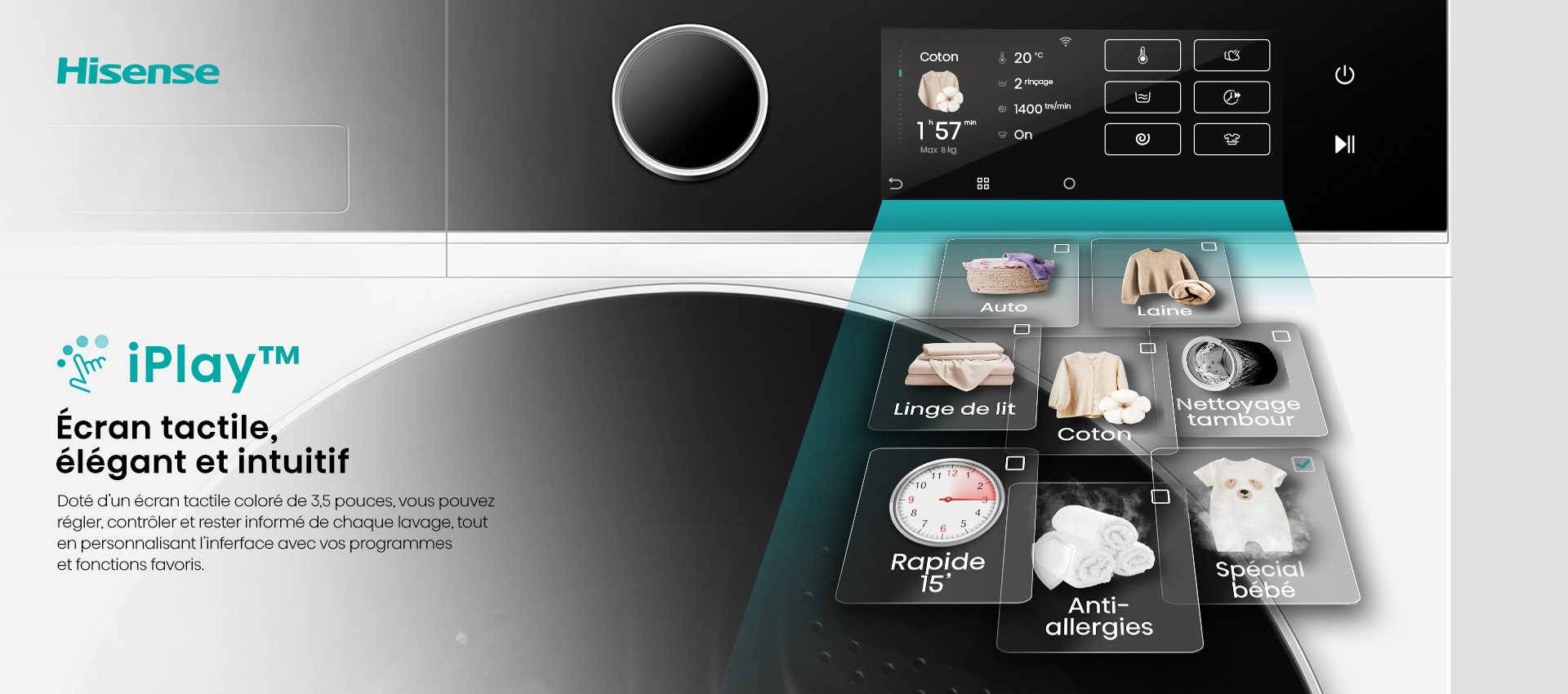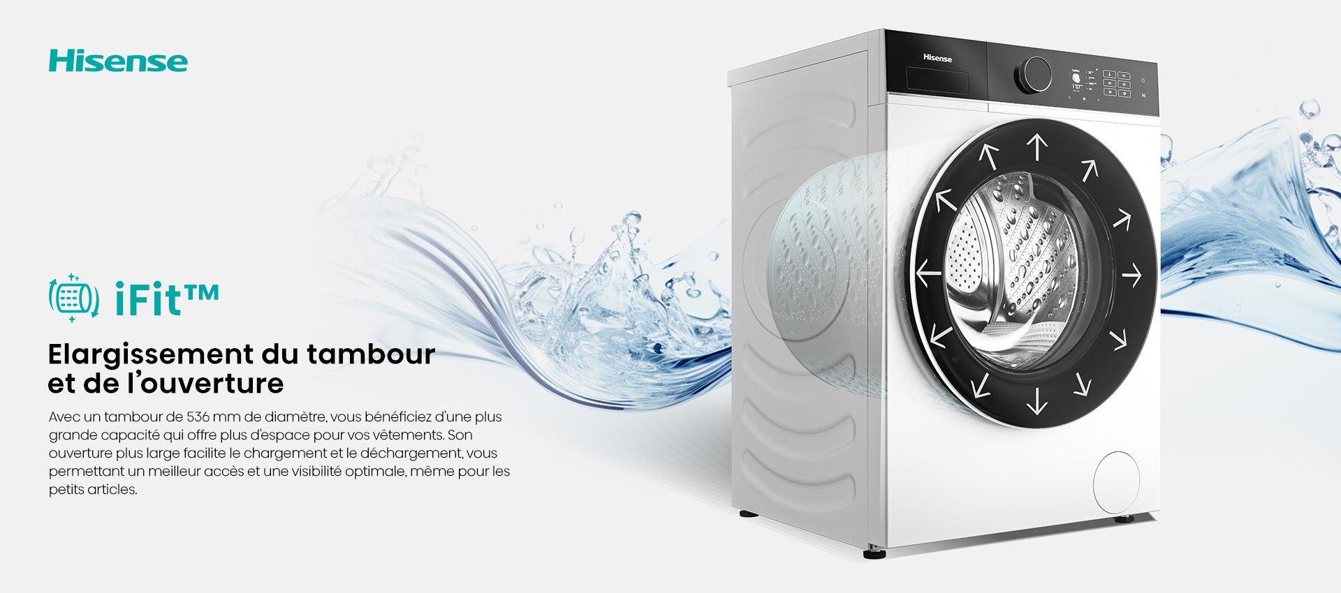 Lave-linge iFit faible profondeur (47cm) qui s'intègrera dans tous vos espaces. Le grand tambour de 54L a été élargi (54cm), tout comme l'ouverture de la porte. 10% plus économe que les standards de la classe A, il dispose d'un écran TFT couleur iPlay de 3,55 pouces ainsi que de la technologie Pure Jet Wash pour des résultats de lavage inégalés.