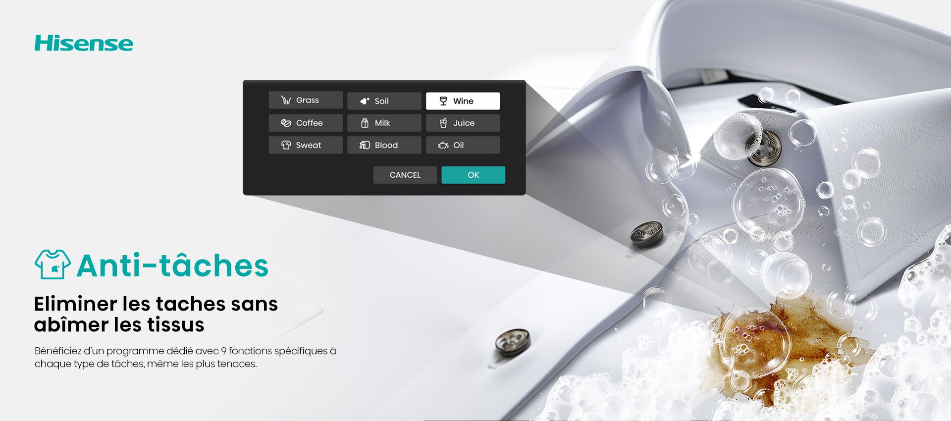 | Programmes | Coton, Coton Eco, Laine, Mix, Textile Sport, Délicat, Spécial bébé, Couleurs foncées, Couette, Rapide 15 mins, Rinçage + Essorage, Essorage, Nettoyage du tambour |