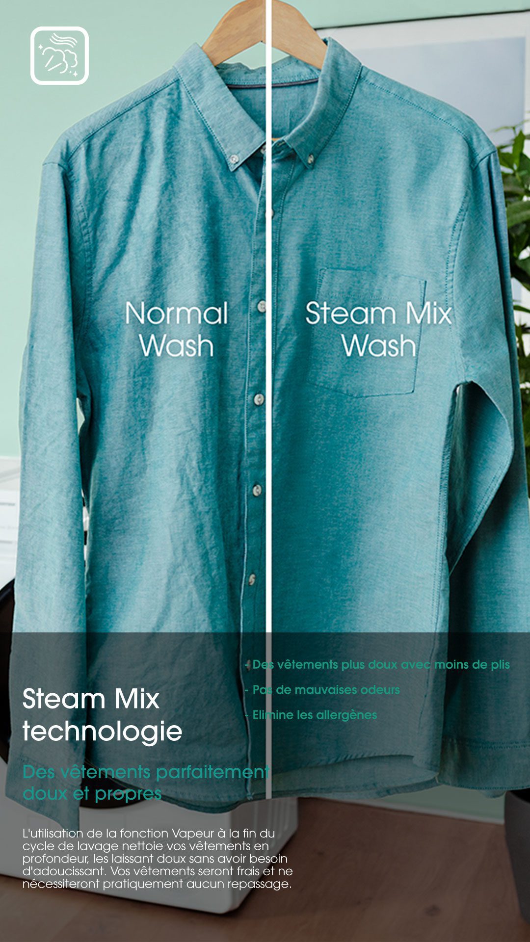 Le programme Anti-Allergie élimine 99,9 % des bactéries, la majorité des allergènes tels que les acariens et les squames d'animaux, et réduit considérablement les rides. La vapeur nettoie en profondeur votre linge et lisse la plupart des plis