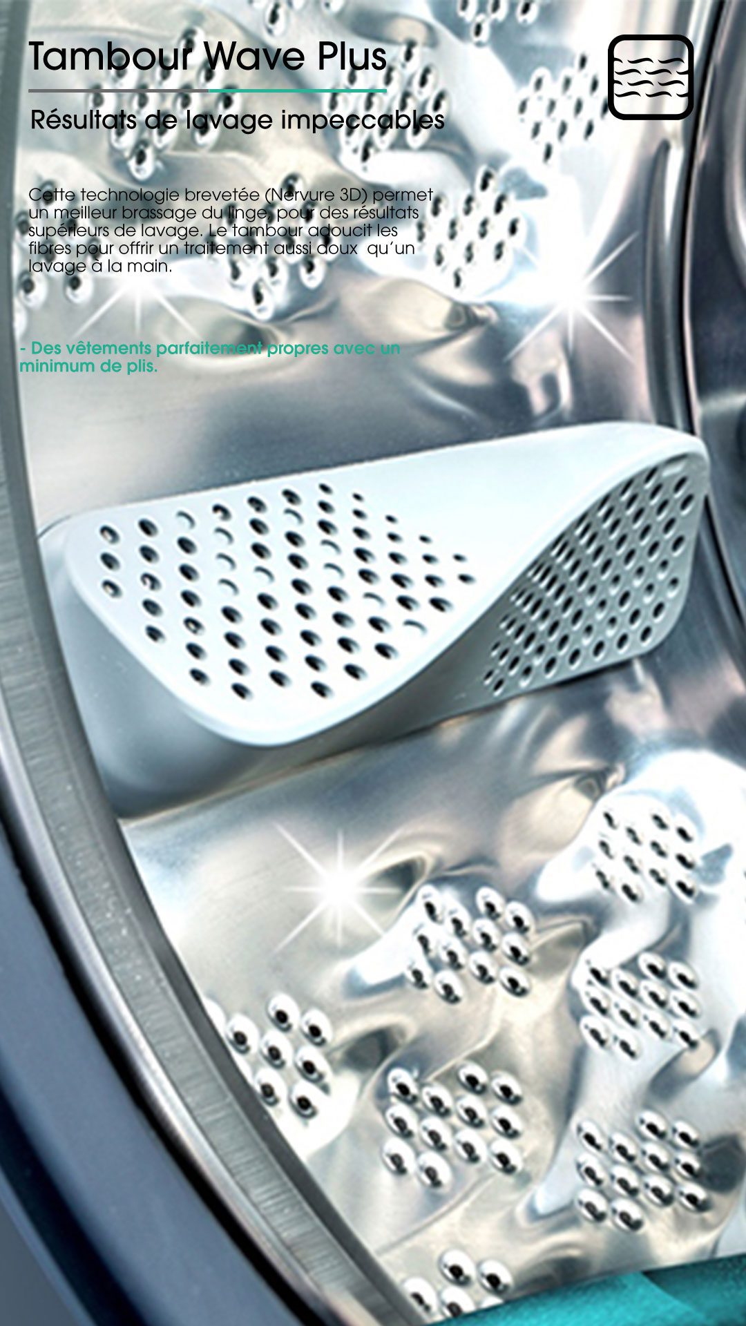 Cette technologie brevetée (Nervure 3D) permet un meilleur brassage du linge, pour des résultats supérieurs de lavage. Le tambour adoucit les fibres pour offrir un traitement aussi doux qu’un lavage à la main.