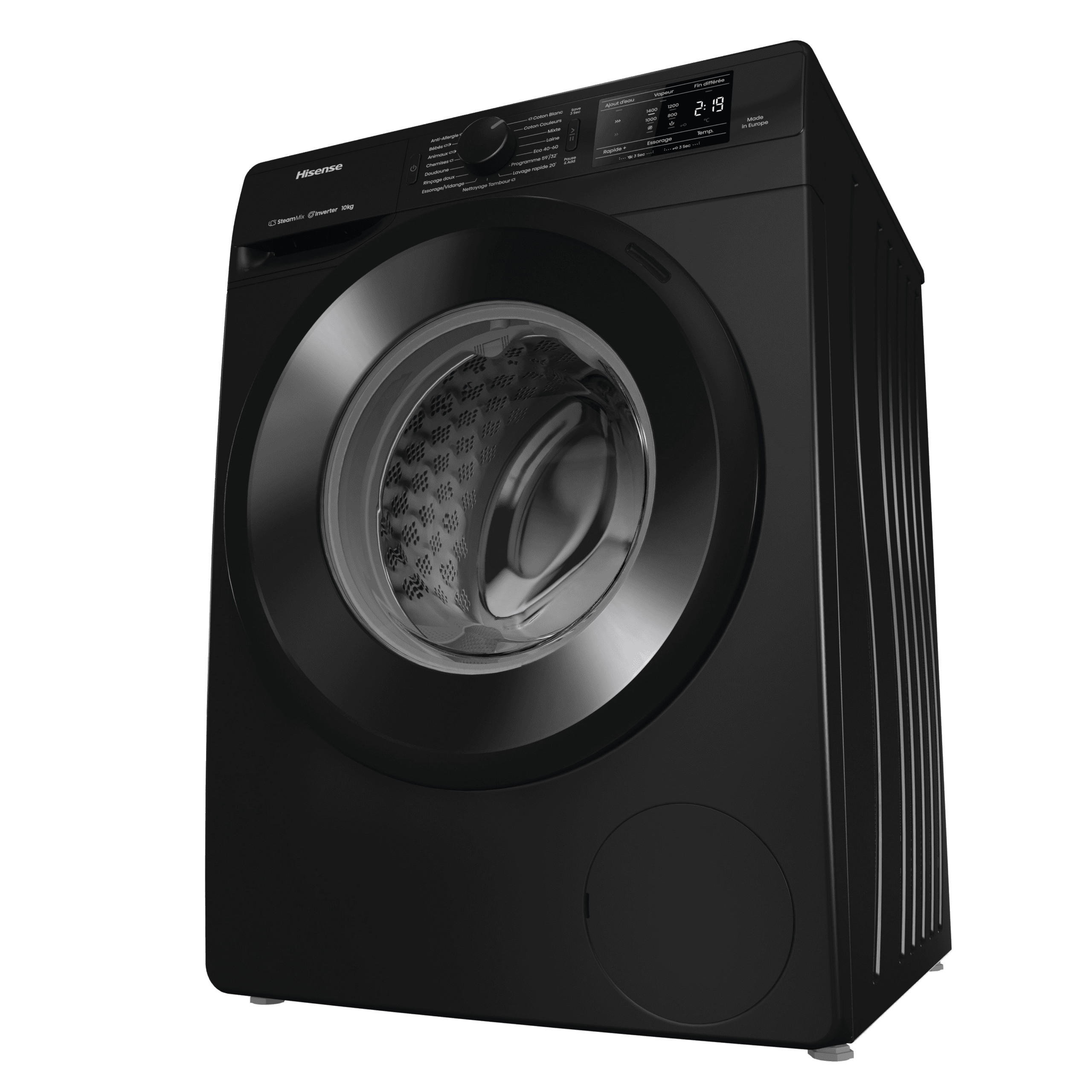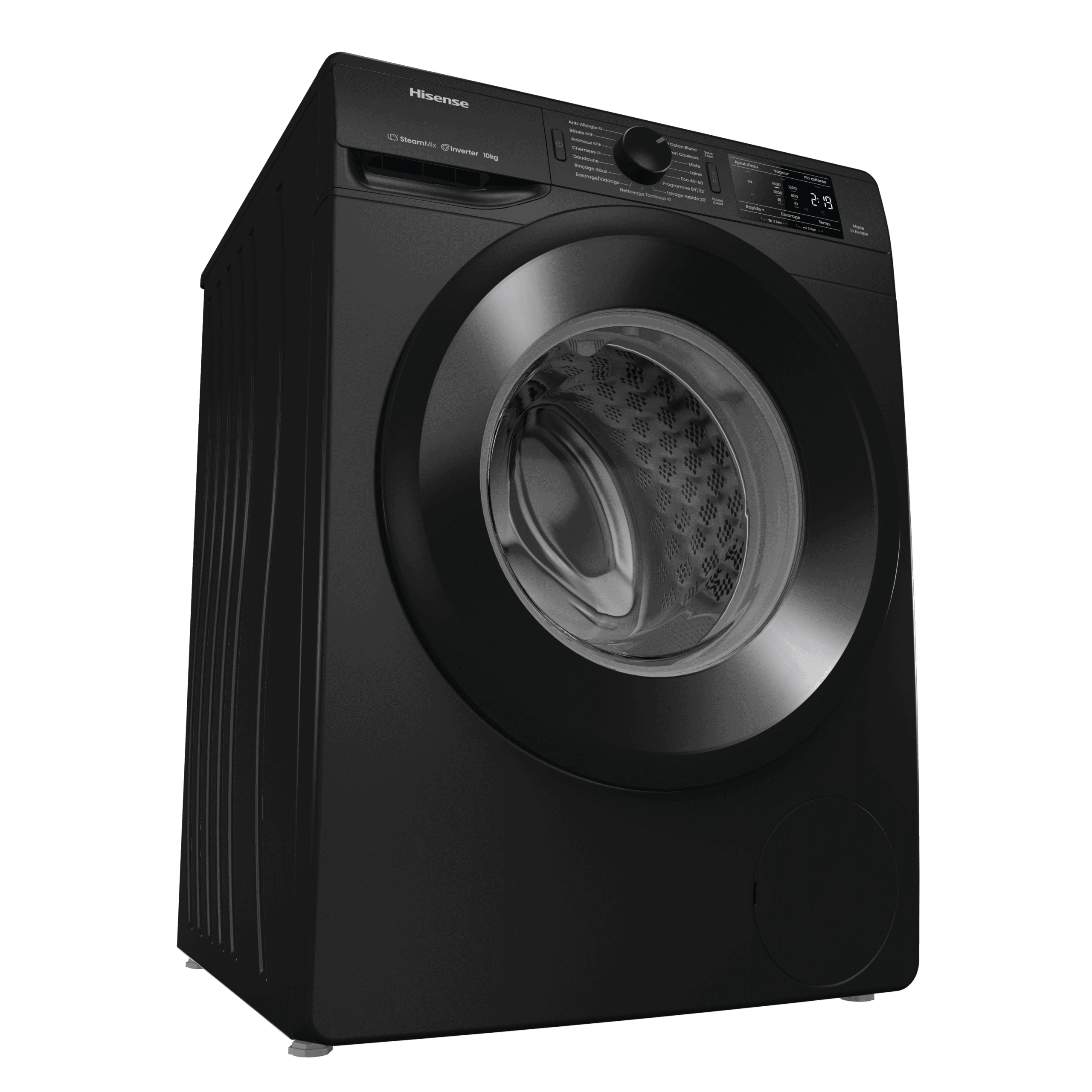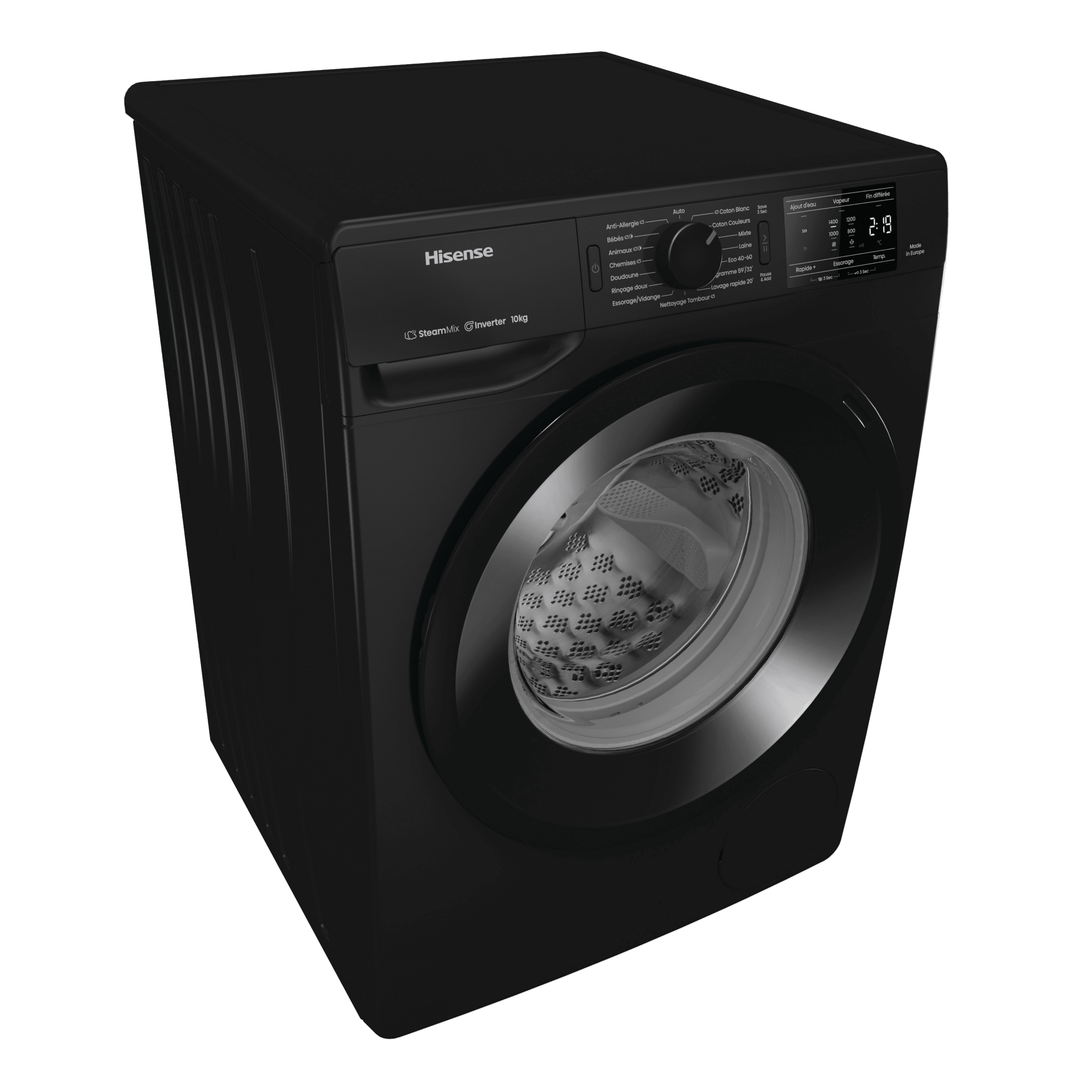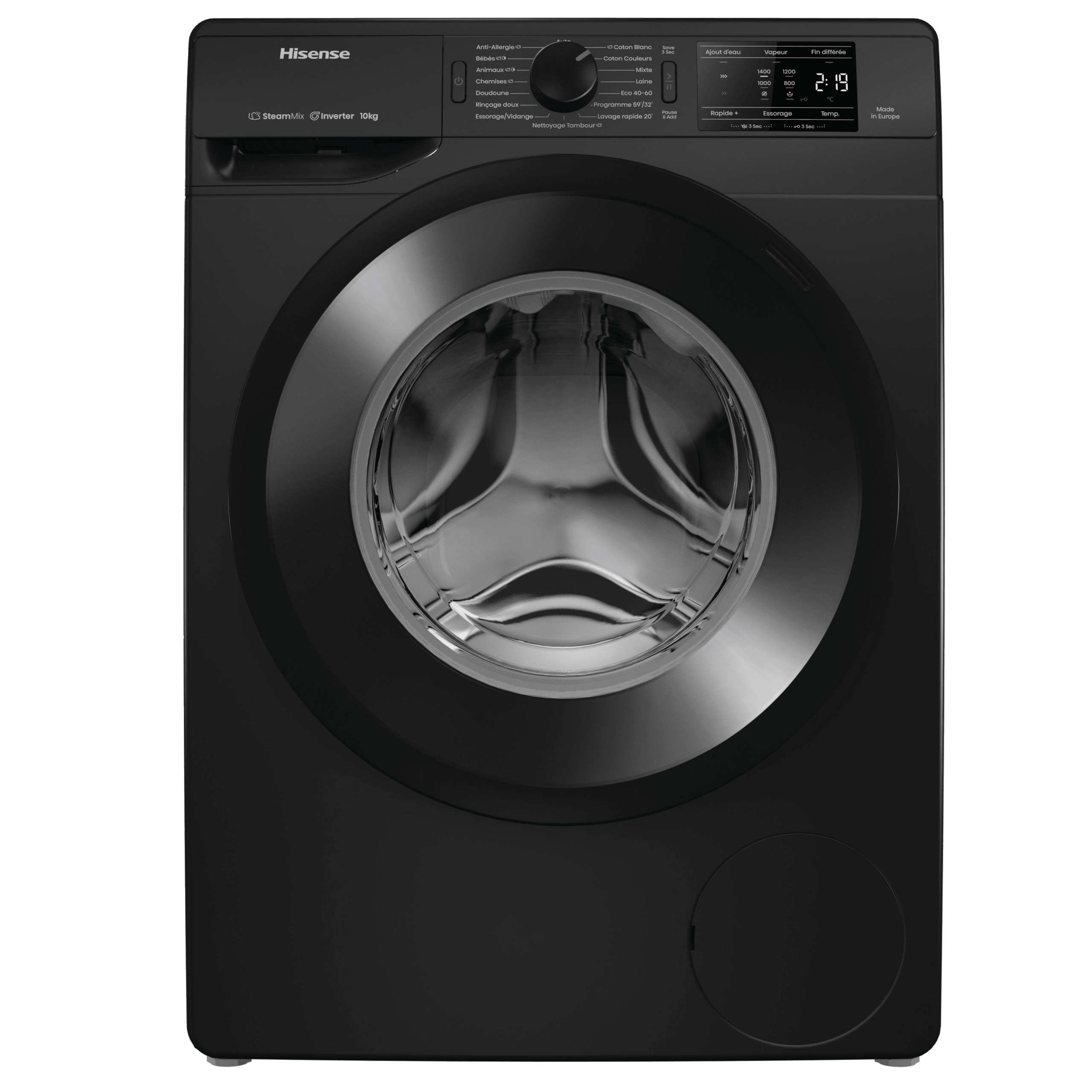 ProgrammesAnti-allergie (Vapeur), Jeans, Laine, Eco 40-60, Nettoyage du tambour, Coton, Mix, Chemises, Rinçage doux, 30° Rapide 20’, Programme 59’/32’, Essorage vidange, Chemises (Vapeur), Coton Eco