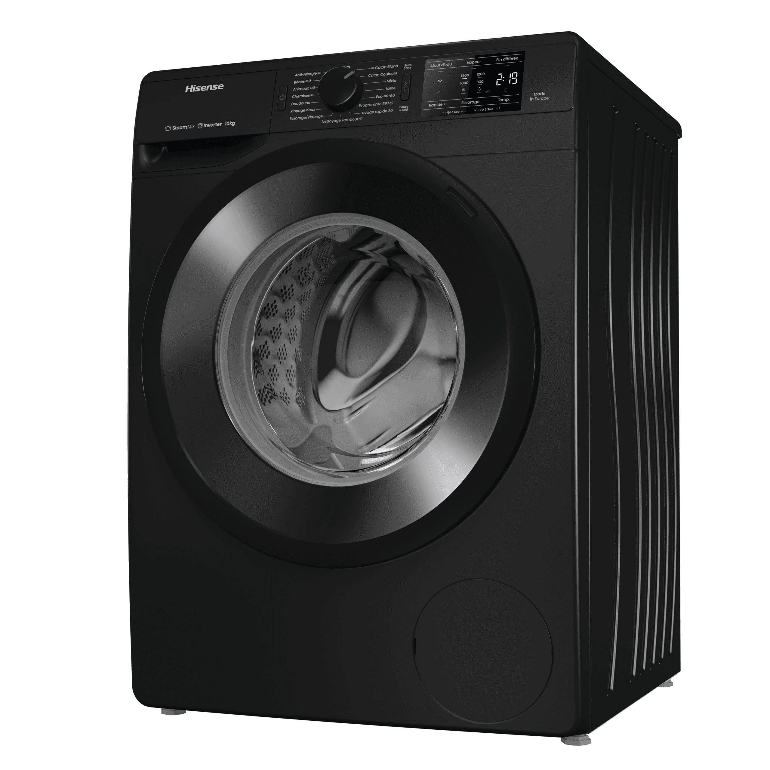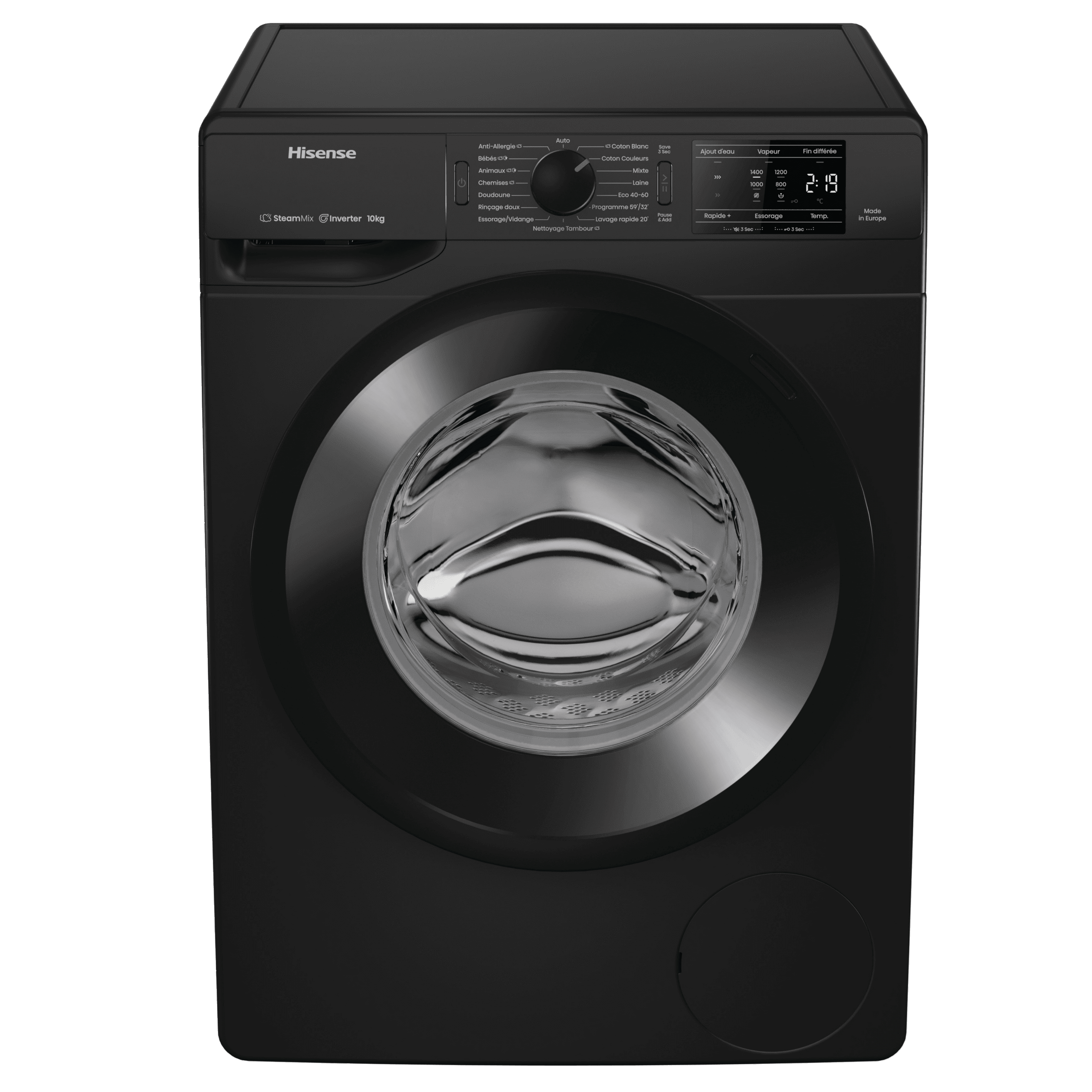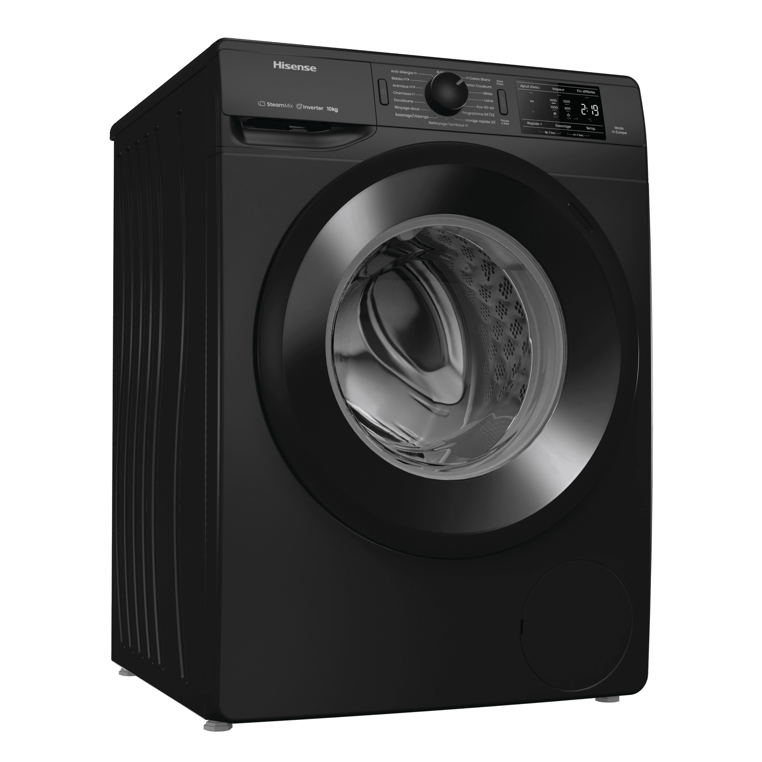 ProgrammesAnti-allergie (Vapeur), Jeans, Laine, Eco 40-60, Nettoyage du tambour, Coton, Mix, Chemises, Rinçage doux, 30° Rapide 20’, Programme 59’/32’, Essorage vidange, Chemises (Vapeur), Coton Eco
