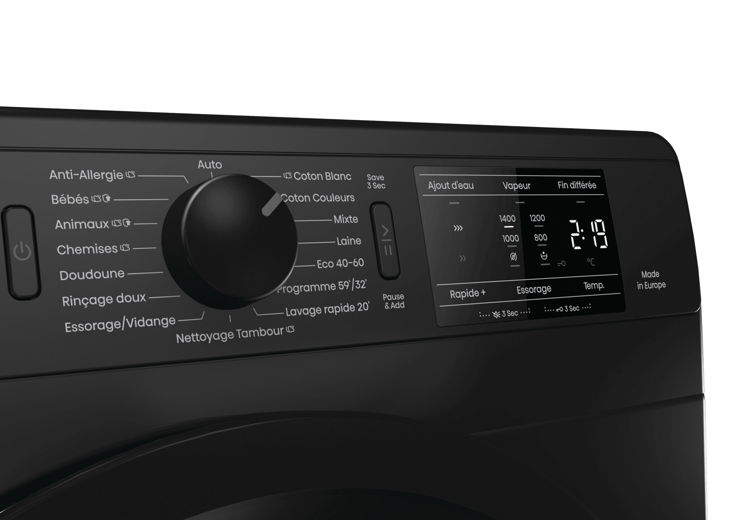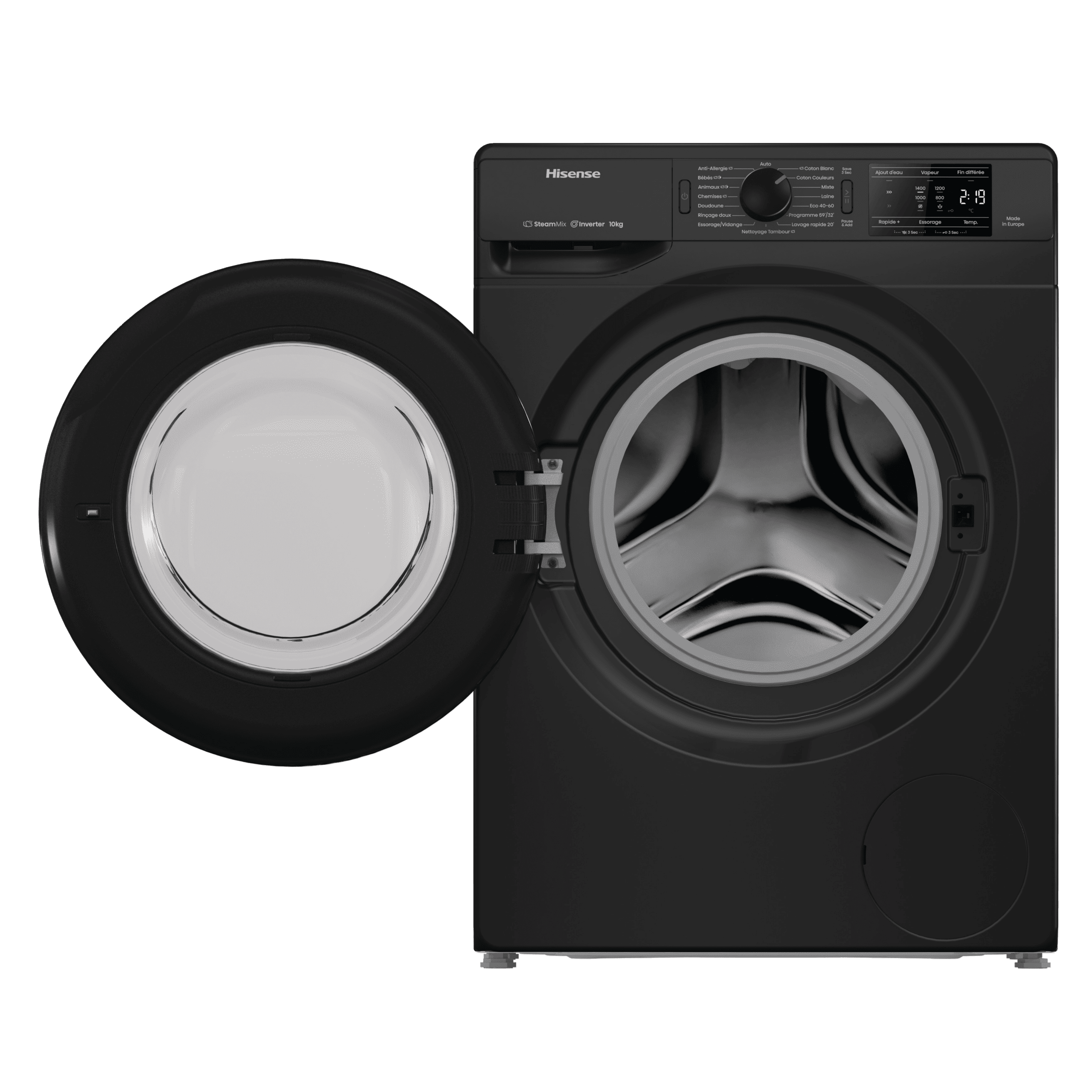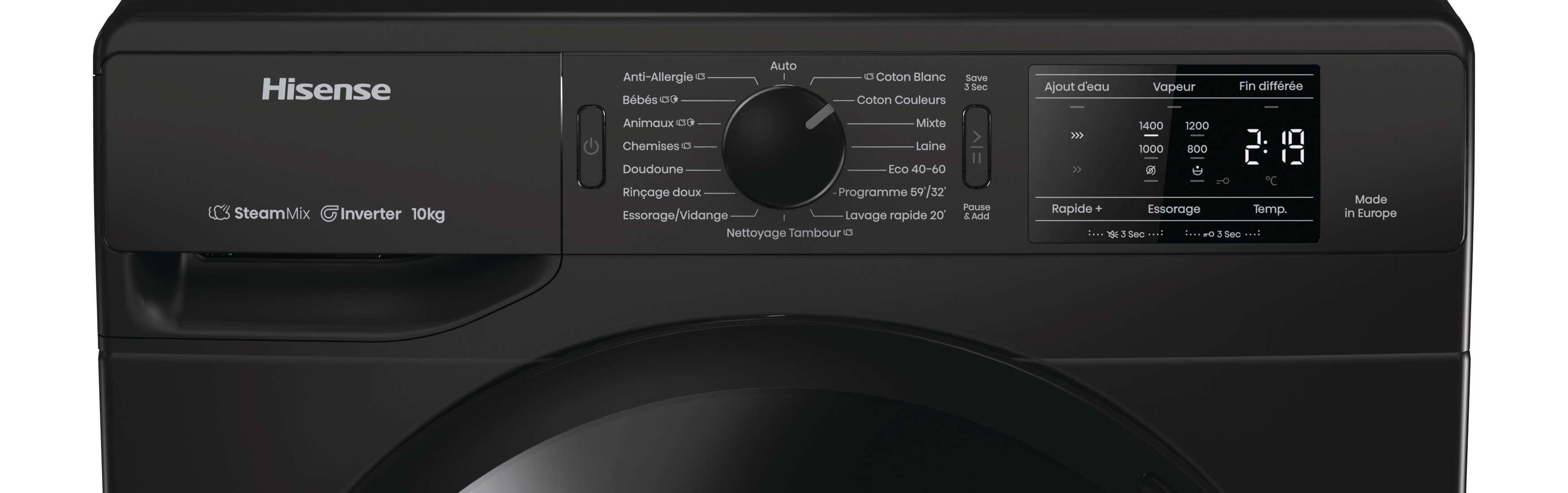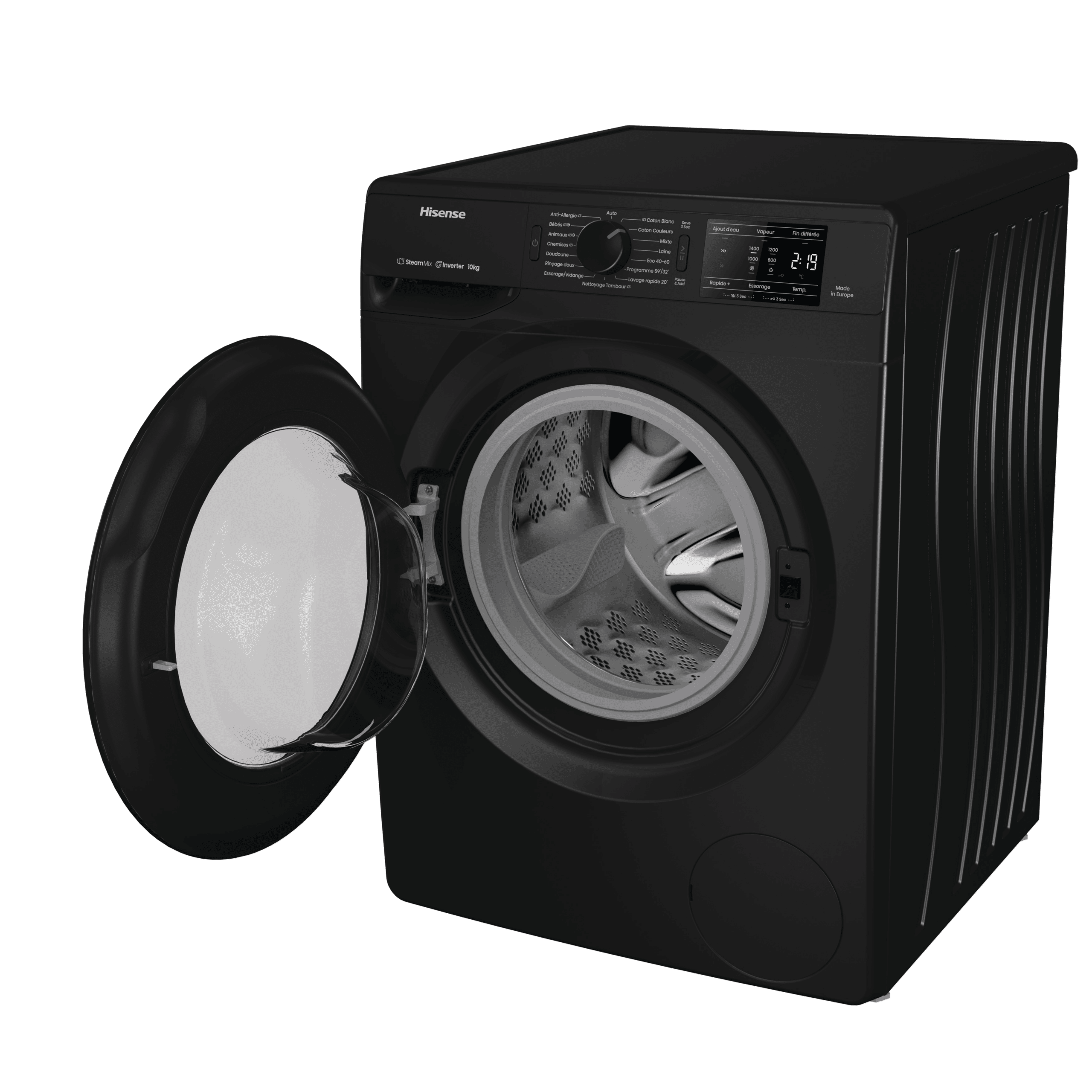 ProgrammesAnti-allergie (Vapeur), Jeans, Laine, Eco 40-60, Nettoyage du tambour, Coton, Mix, Chemises, Rinçage doux, 30° Rapide 20’, Programme 59’/32’, Essorage vidange, Chemises (Vapeur), Coton Eco