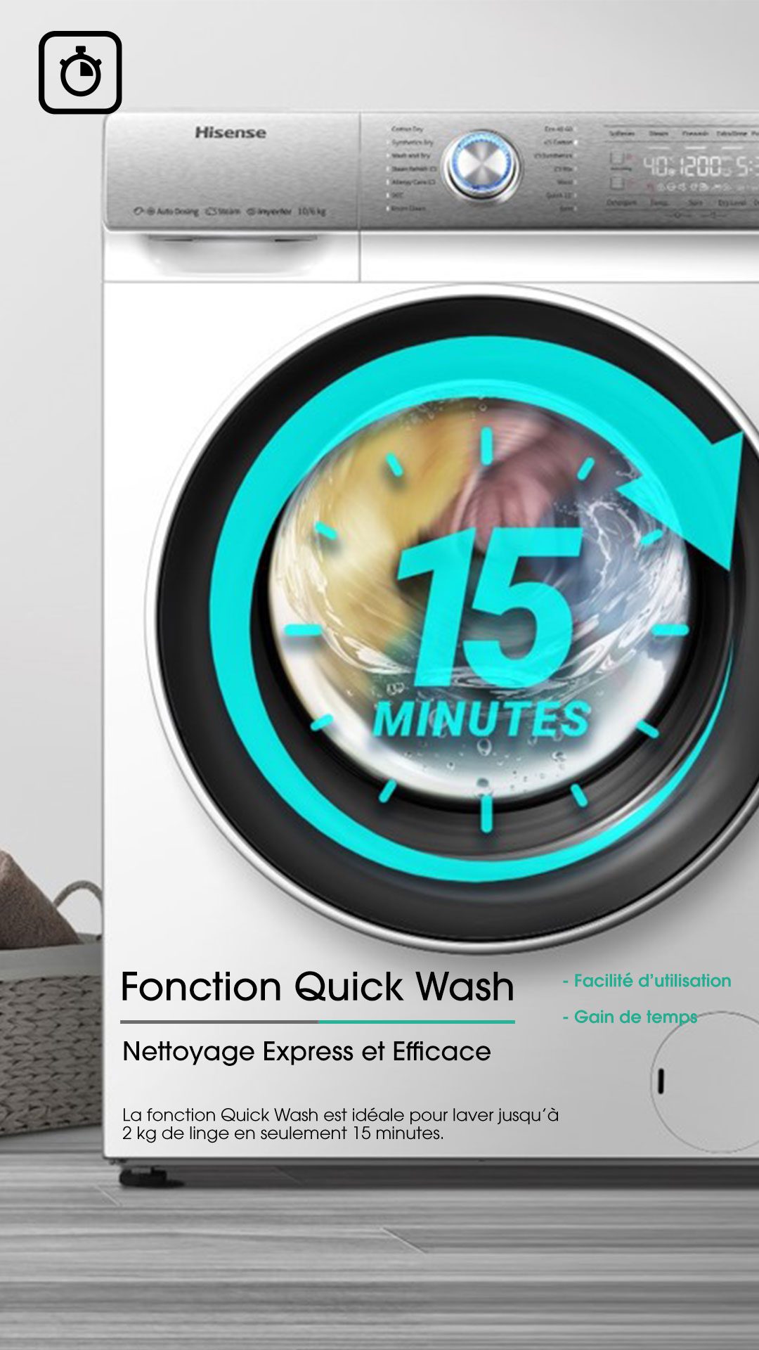 La fonction Quick Wash est idéale pour laver jusqu’à 2 kg de linge en seulement 15 minutes.
