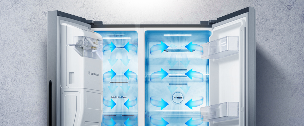 L’air froid est distribué par les colonnes à chaque étage afin de permettre un refroidissement rapide et homogène des aliments quel que soit leur emplacement et même si le réfrigérateur est rempli.
