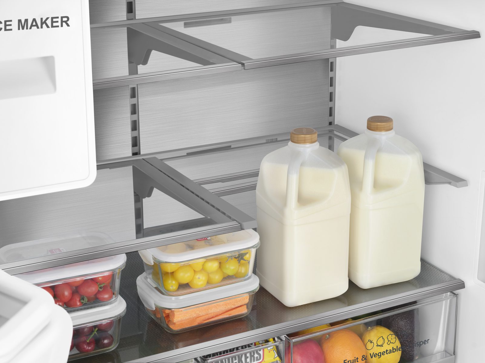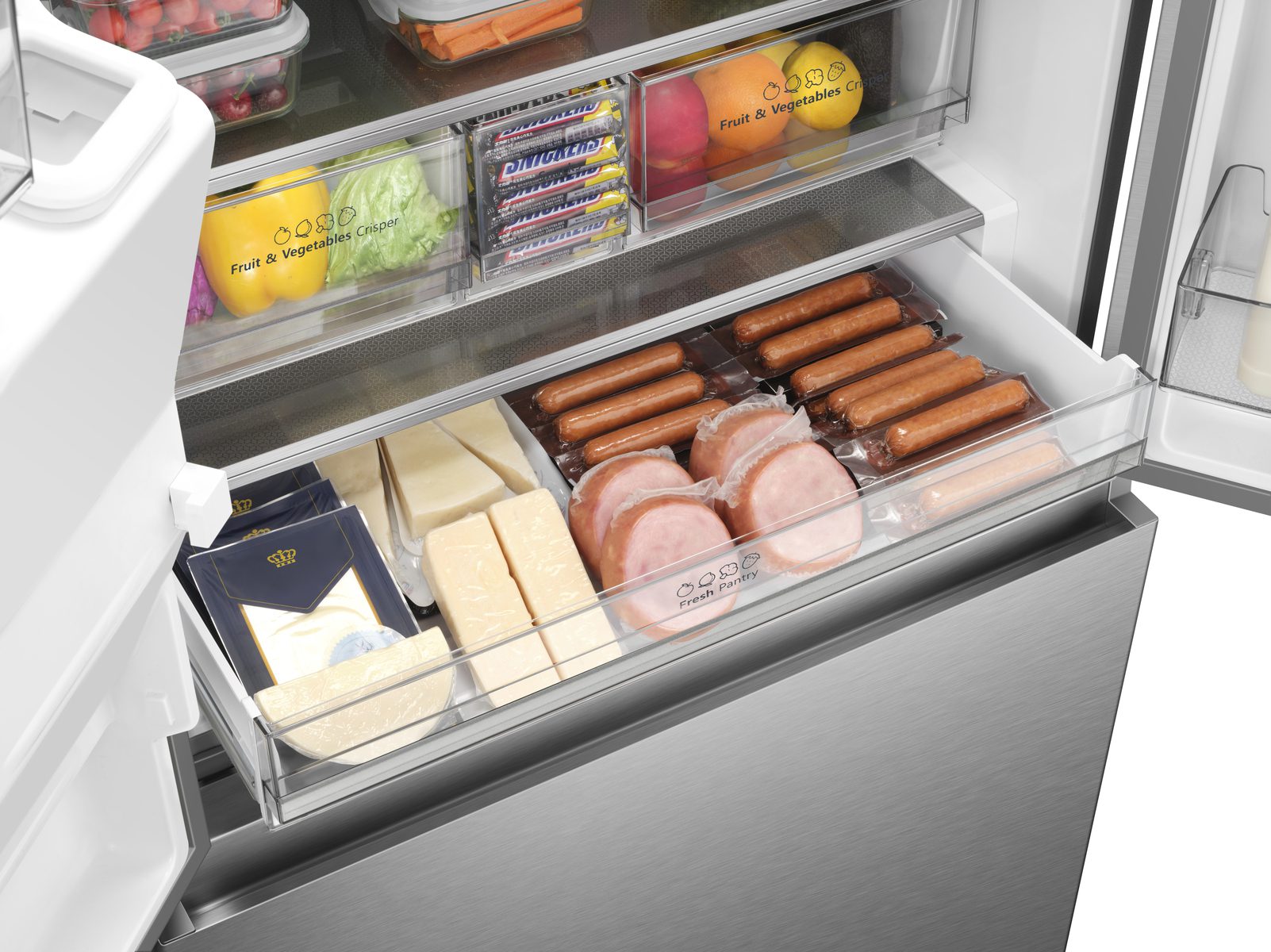 Vos denrées fraiches sont mieux conservées grâce à un contrôle d’humidité par commande du ou des bacs fruits et légumes. Selon la nature de vos aliments, vous pouvez choisir un taux d’humidité faible à élevé.